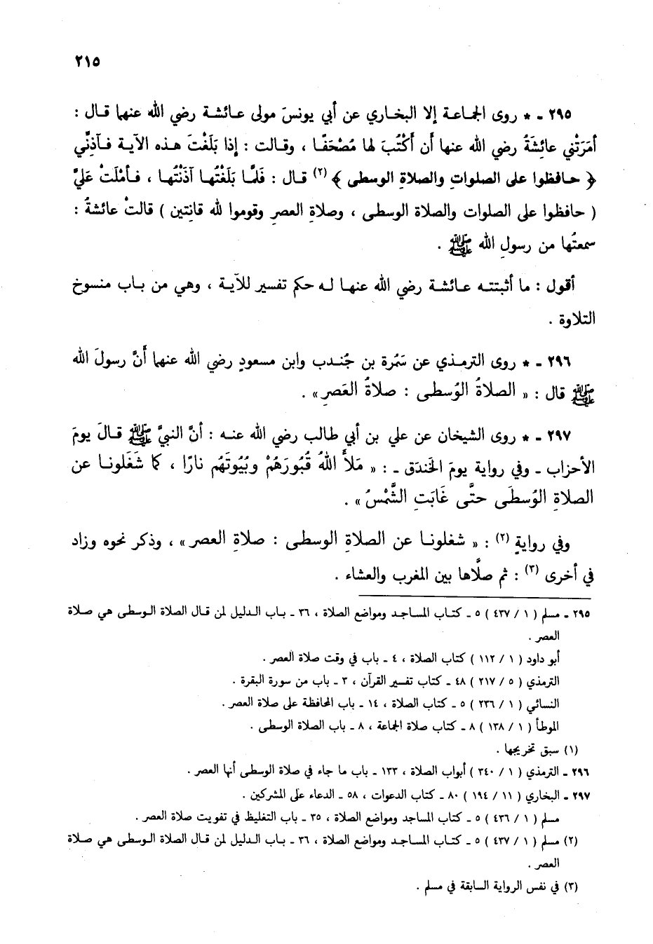 295 - * روى الجماعة إلا البخاري عن أبي يونس مولى عائشة رضي الله عنهما قال: أمرتني عائشةُ رضي الله عنها أن أكْتُبَ لها مصحفاً، وقالت: إذا بلغتَ هذه الآية فآذني {حَافِظُوا عَلَى الصَّلَوَاتِ وَالصَّلَاةِ الْوُسْطَى} (1) قال: فلما بلغتها آذنتها، فأملت عليَّ (حافظوا على الصلوات والصلاة الوسطى، وصلاة العصر وقوموا لله قانتين) قالت عائشة: سمعتها من رسول الله صلى الله عليه وسلم.