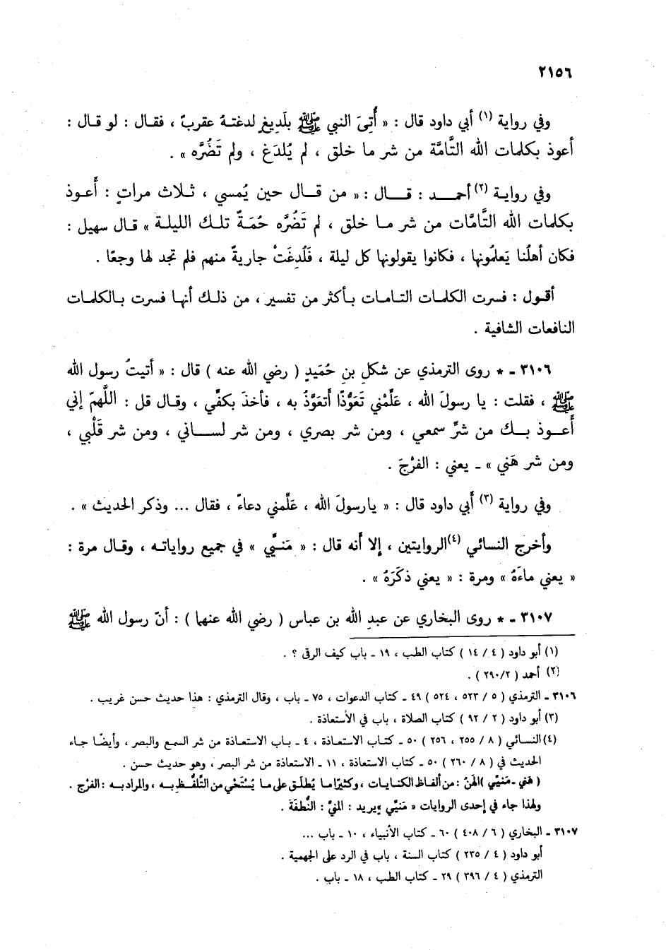 وفي رواية (1) أبي داود قال: "أتي النبي صلى الله عليه وسلم بلديغ لدغته عقرب، فقال: لو قال: أعوذ بكلمات الله التامة من شر ما خلق، لم يلدغ، ولم تضره".
