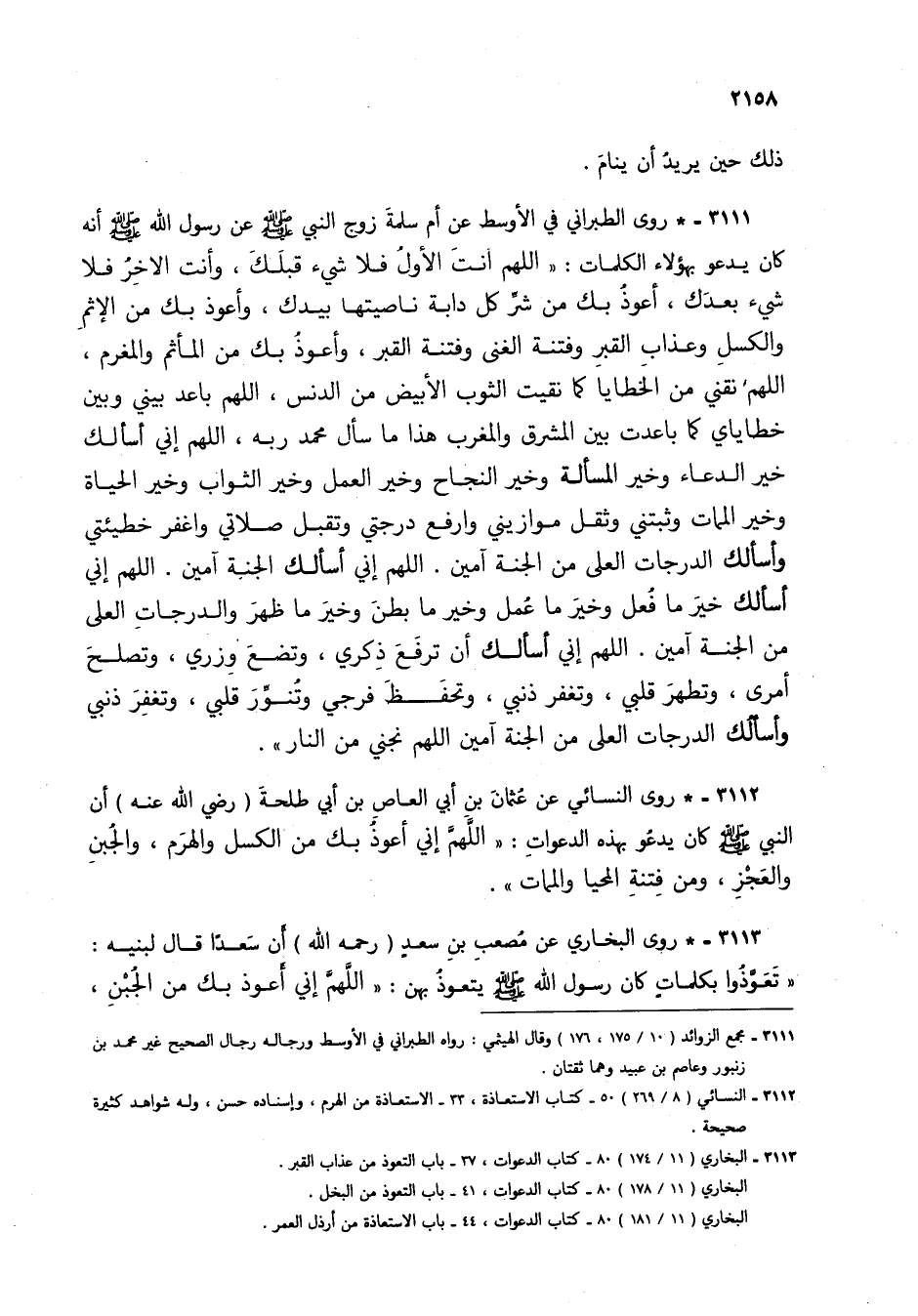 3111 - * روى الطبراني في الأوسط عن أم سلمة زوج النبي صلى الله عليه وسلم عن رسول الله صلى الله عليه وسلم أنه كان يدعو بهؤلاء الكلمات: "اللهم أنت الأول فلا شيء قبلك، وأنت الآخر فلا شيء بعدك، أعوذ بك من شر كل دابة ناصيتها بيدك، وأعوذ بك من الإثم والكسل وعذاب القبر وفتنة الغنى وفتنة القبر، وأعوذ بك من المأثم والمغرم، اللهم نقني من الخطايا كما نقيت الثوب الأبيض من الدنس، اللهم باعد بيني وبين خطاياي كما باعدت بين المشرق والمغرب هذا ما سأل محمد ربه، اللهم إني أسألك خير الدعاء وخير المسألة وخير النجاح وخير العمل وخير الثواب وخير الحياة وخير الممات وثبتني وثقل موازيني وارفع درجتي وتقبل صلاتي واغفر خطيئتي وأسألك الدرجات العلي من الجنة آمين. اللهم إني أسألك الجنة آمين. اللهم إني أسألك خير ما فعل وخير ما عمل وخير ما بطن وخير ما ظهر والدرجات العلي من الجنة آمين. اللهم إني أسألك أن ترفع ذكري، وتضع وزري، وتصلح أمري، وتطهر قلبي، وتغفر ذنبي، وتحفظ فرجي وتنور قلبي، وتغفر ذنبي وأسألك الدرجات العلي من الجنة آمين اللهم نجني من النار".