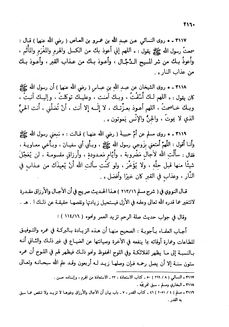 3119 - * روى مسلم عن أم حبيبة (رضي الله عنها) قالت: "سمعني رسول الله صلى الله عليه وسلم وأنا أقول: اللهم أمتعني بزوجي رسول الله صلى الله عليه وسلم، وبأبي أبي سفيان، وبأخي معاوية، فقال: سألت الله لآجال مضروبة، وأيام معدودة، وأرزاق مقسومة، لن يعجل شيئاً منها قبل حله، ولا يؤخر، ولو كنت سألت الله أن يعيذك من عذاب في النار، وعذاب في القبر كان خيراً وأفضل".