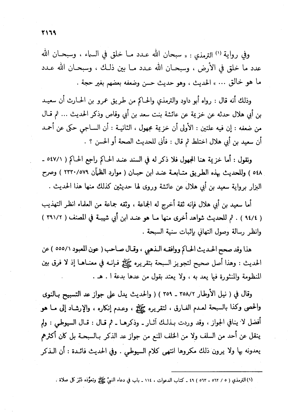 أما سعيد بن أبي هلال فإنه ثقة أخرج له الجماعة، وثقه جماعة من العلماء انظر التهذيب (4/ 94). ثم للحديث شواهد أخرى منها ما هو عند ابن أبي شيبة في المصنف (2/ 391) وانظر رسالة وصول التهاني بإثبات سنية السبحة.