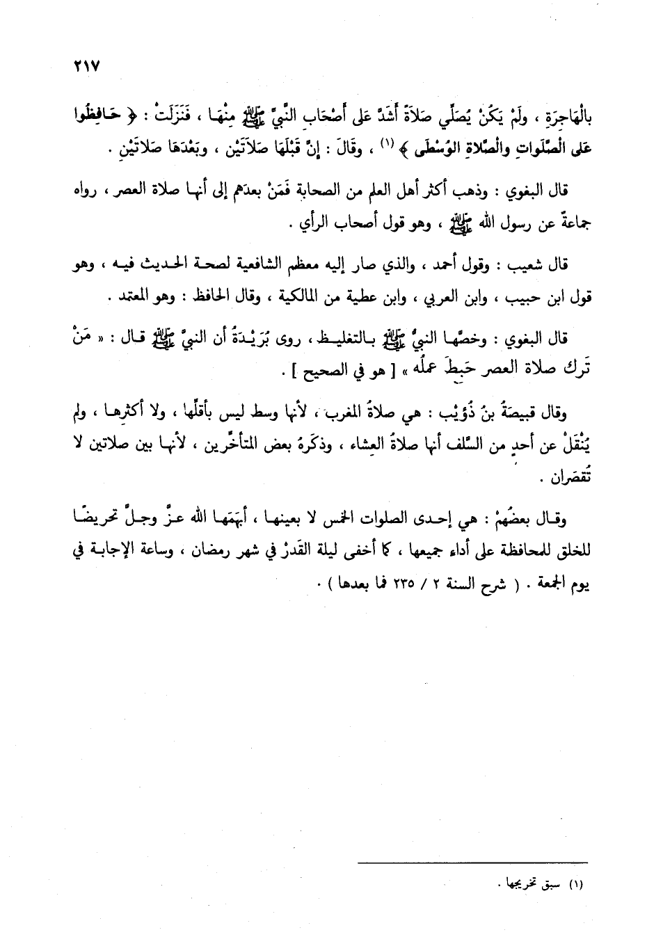 وقال بعضهم: هي إحدى الصلوات الخمس لا بعينها، أبهمها الله عز وجل تحيضاً للخلق للمحافظة على أداء جميعها، كما أخفى ليلة القَدرْ في شهر رمضان، وساعة الإجابة في يوم الجمعة. (شرح السنة 2/ 235 فما بعدها).