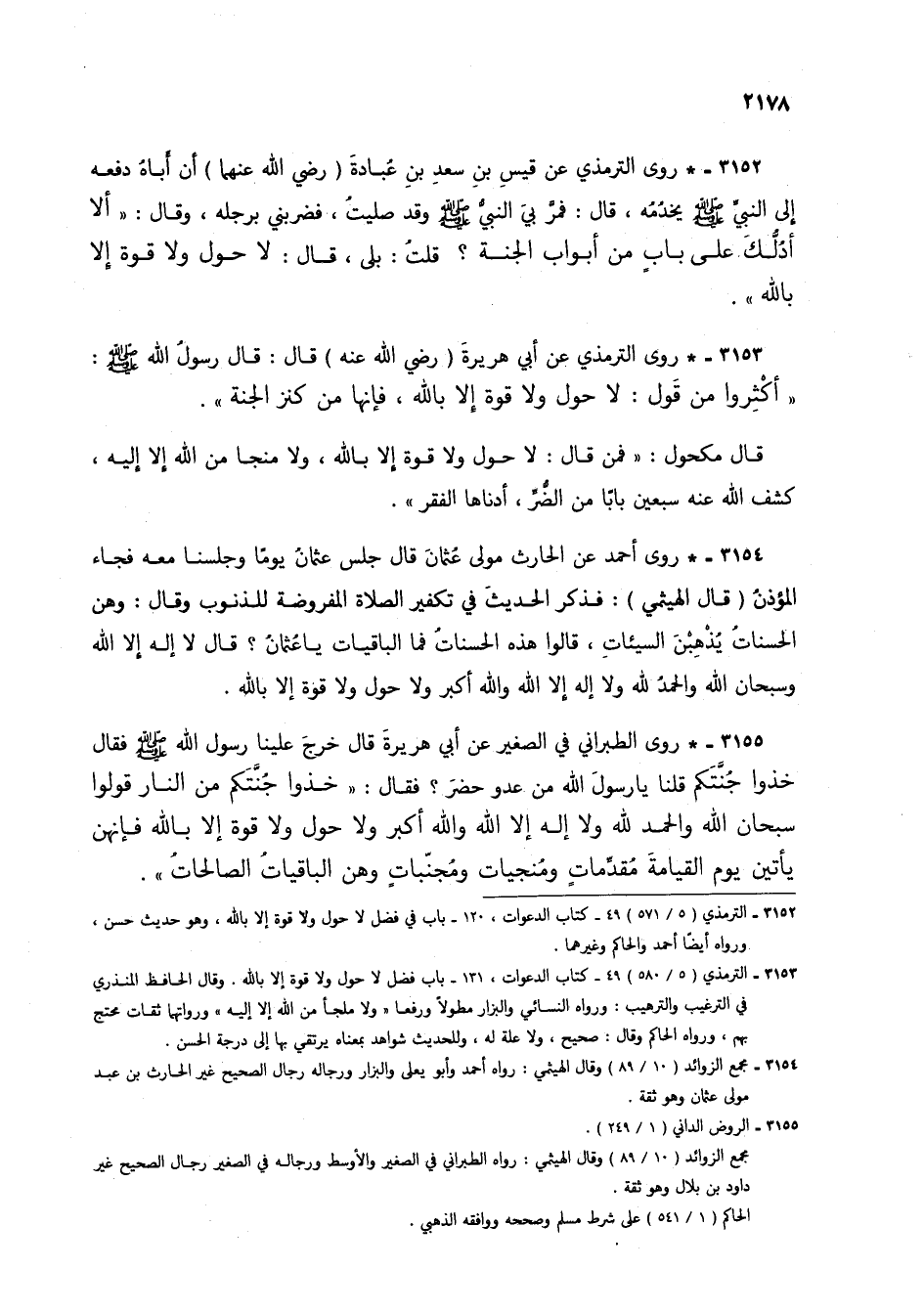 3153 - * روى الترمذي عن أبي هريرة (رضي الله عنه) قال: قال رسول الله صلى الله عليه وسلم: "أكثروا من قول: لا حول ولا قوة إلا بالله، فإنها من كنز الجنة".