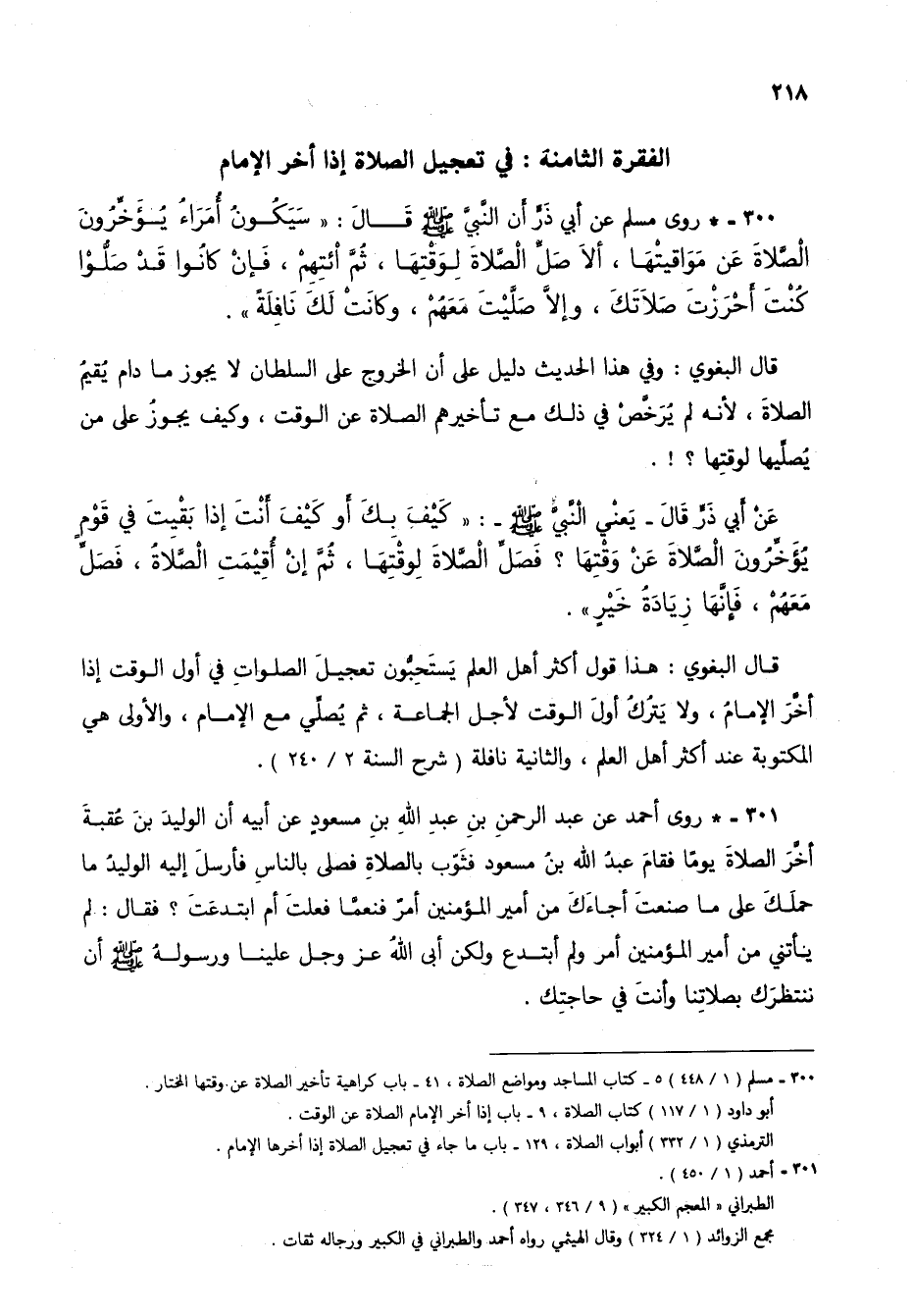 300 - * روى مسلم عن أبي ذرَّ أن النبي صلى الله عليه وسلم قال: "سيكون أمراء يُؤخرون الصلاة عن مواقيتها، ألا صل الصلاة لوقتها، ثم أئئتهم، فإن كانوا قد ضلوا كنت أحرزت صلاتك، وإلا صليت معهم، وكانت لك نافلة".