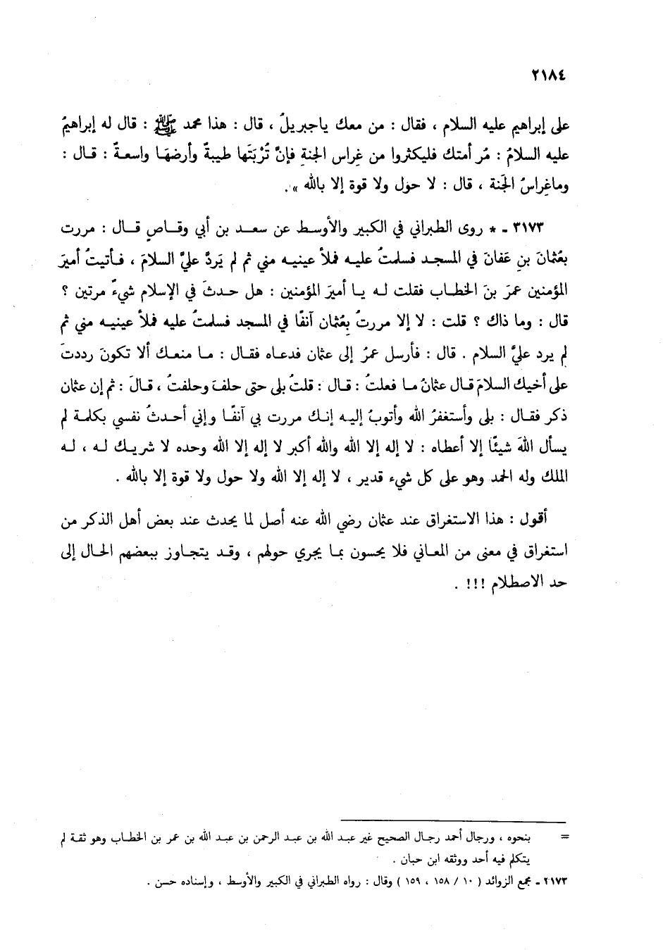 3173 - * روى الطبراني في الكبير والأوسط عن سعد بن أبي وقاص قال: مررت بعثمان بن عفان في المسجد فسلمت عليه فملأ عينيه مني ثم لم يرد علي السلام، فأتيت أمير المؤمنين عمر بن الخطاب فقلت له يا أمير المؤمنين: هل حدث في الإسلام شيء مرتين؟ قال: وما ذاك؟ قلت: لا إلا مررت بعثمان آنفاً في المسجد فسلمت عليه فملأ عينيه مني ثم لم يرد علي السلام. قال: فأرسل عمر إلى عثمان فدعاه فقال: ما منعك ألا تكون رددت على أخيك السلام قال عثمان ما فعلت: قال: قلت بلى حتى حلف وحلفت، قال: ثم إن عثمان ذكر فقال: بلى وأستغفر الله وأتوب إليه إنك مررت بي آنفاً وإني أحدث نفسي بكلمة لم يسأل الله شيئاً إلا أعطاه: لا إله إلا الله والله أكبر لا إله إلا الله وحده لا شريك له، له الملك وله الحمد وهو على كل شيء قدير، لا إله إلا الله ولا حول ولا قوة إلا بالله.