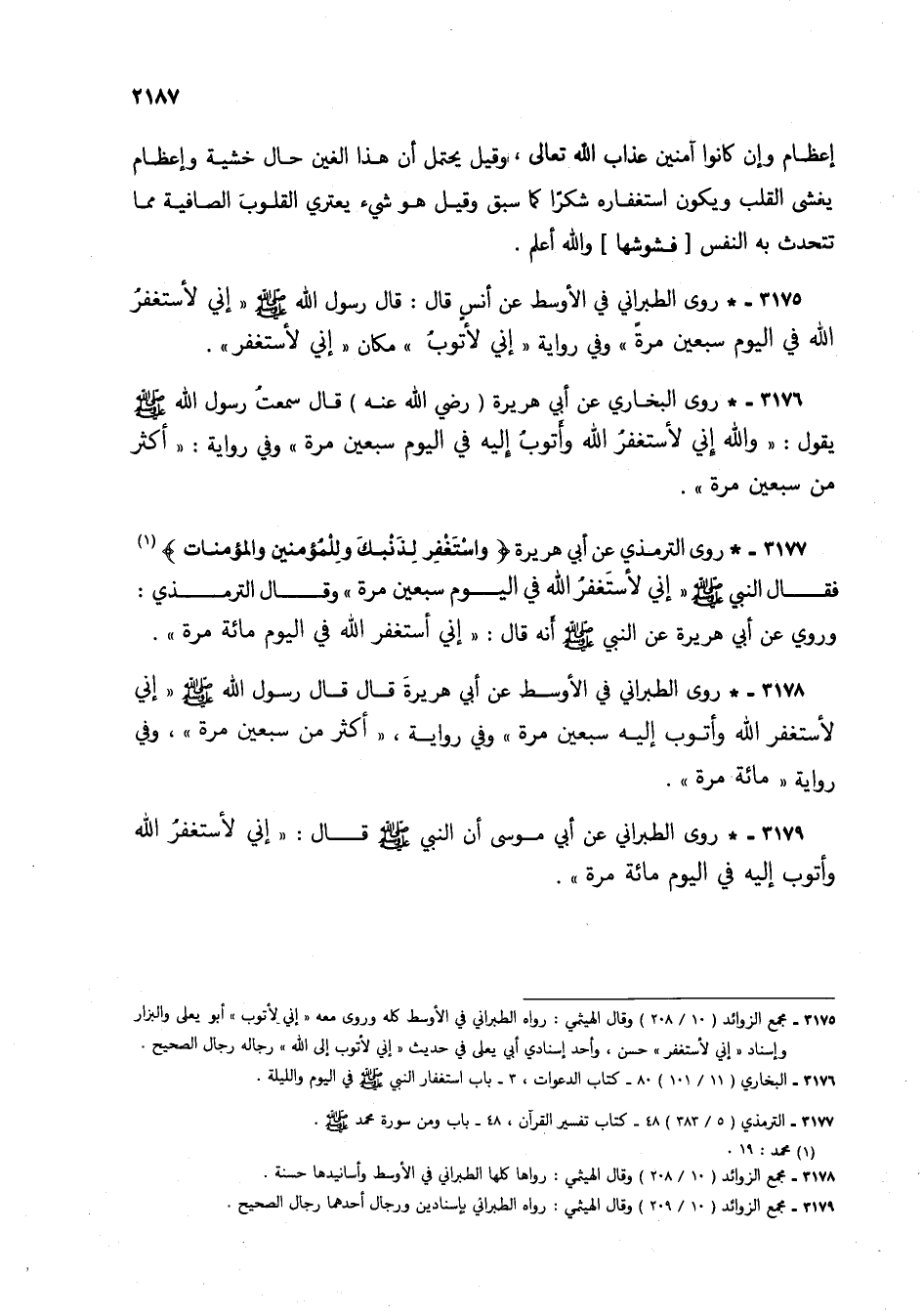 3178 - * روى الطبراني في الأوسط عن أبي هريرة قال قال رسول الله صلى الله عليه وسلم "إني لأستغفر الله وأتوب إليه سبعين مرة" وفي رواية، "أكثر من سبعين مرة"، وفي رواية "مائة مرة".