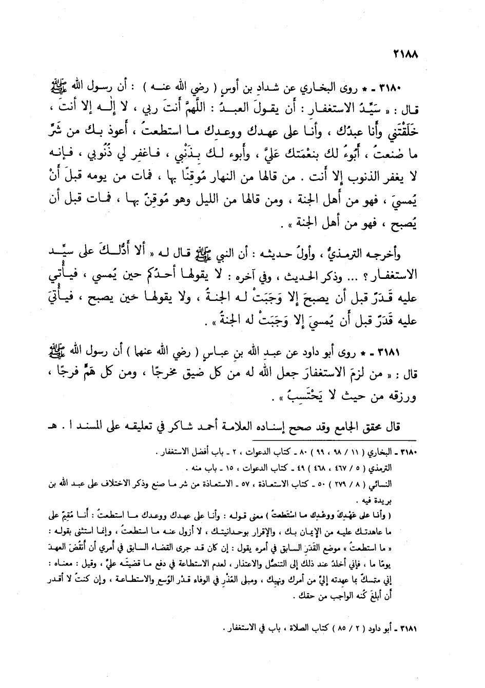 3180 - * روى البخاري عن شداد بن أوس (رضي الله عنه): أن رسول الله صلى الله عليه وسلم قال: "سيد الاستغفار: أن يقول العبد: اللهم أنت ربي لا إله إلا أنت، خلقتني وأنا عبدك، وأنا على عهدك ووعدك ما استطعت، أعوذ بك من شر ما صنعت، أبوء لك بنعمتك علي، وأبوء لك بذنبي، فاغفر لي ذنوبي، فإنه لا يغفر الذنوب إلا أنت. من قالها من النهار موقناً بها، فمات من يومه قبل أن يمسي، فهو من أهل الجنة، ومن قالها من الليل وهو موقن بها، فمات قبل أن يصبح، فهو من أهل الجنة".