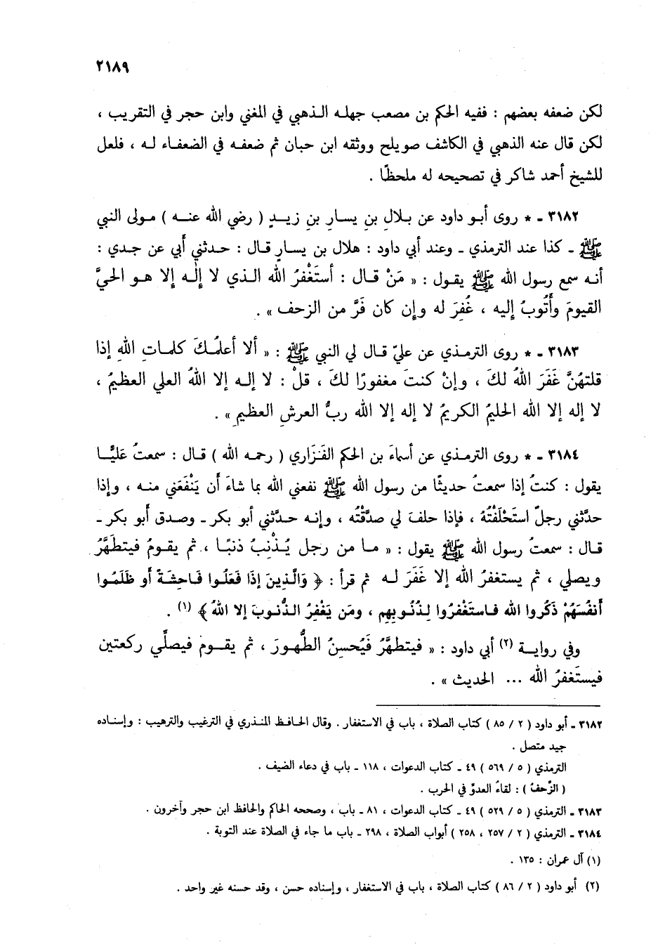 3184 - * روى الترمذي عن أسماء بن الحكم الفزاري (رحمه الله) قال: سمت علياً يقول: كنت إذا سمعت حديثاً من رسول الله صلى الله عليه وسلم نفعني الله بما شاء أن ينفعني منه، وإذا حدثني رجل استحلفته، فإذا حلف لي صدقته، وإنه حدثني أبو بكر- وصدق أبو بكر- قال: سمعت رسول الله صلى الله عليه وسلم يقول: "ما من رجل يذنب ذنباً، ثم يقوم فيتطهر ويصلي، ثم يستغفر الله إلا غفر له ثم قرأ: (والذين إذا فعلوا فاحشة أو ظلموا أنفسهم ذكروا الله فاستغفروا لذنوبهم، ومن يغفر الذنوب إلا الله) (1).