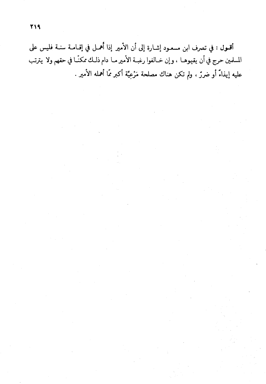 أقول: في تصرف ابن مسعود إشارة إلى أن الأمير إذا أهمل في إقامة سنة فليس على المسلمين حرج في أن يقيموها، وإن خالفوا رغبة الأمير ما دام ذلك ممكناً في حقهم ولا يترتب عليه إيذاء أو ضرر، ولم تكن هناك مصلحة مرعية أكبر مما أهمله الأمير.