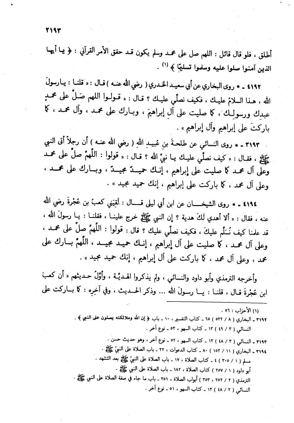 3193 - * روى النسائي عن طلحة بن عبيد الله (رضي الله عنه) أن رجلاً أتى النبي صلى الله عليه وسلم، فقال: "كيف نصلي عليك يا نبي الله؟ قال: "قولوا: اللهم صل على محمد وعلى آل محمد كما صليت على إبراهيم، إنك حمد مجيد، وبارك على محمد، وعلى آل محمد، كما باركت على إبراهيم، إنك حميد مجيد".