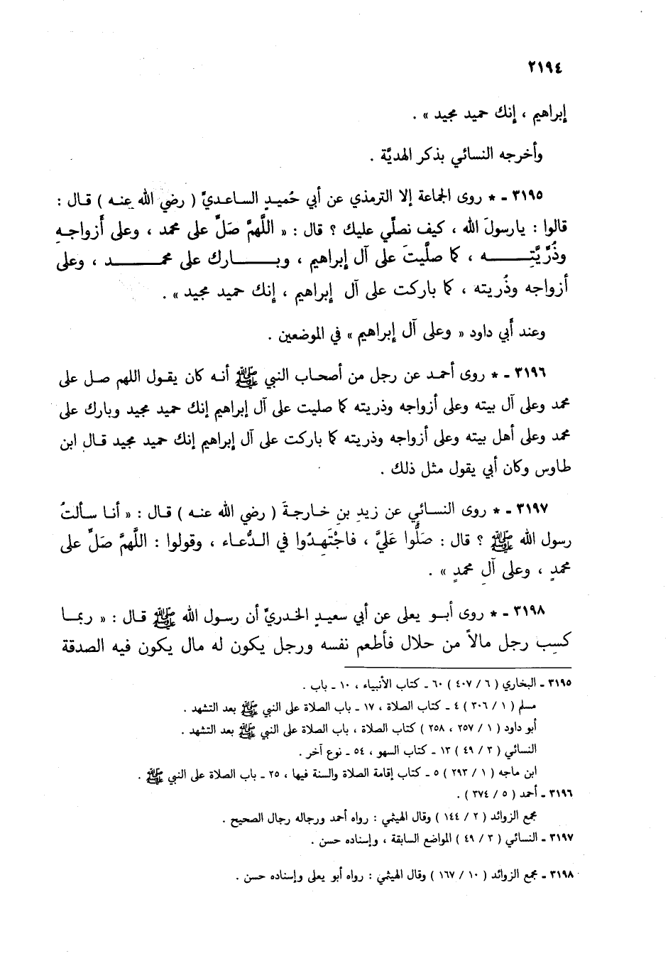 3195 - * روى الجماعة إلا الترمذي عن أبي حميد الساعدي (رضي الله عنه) قال: قالوا: يا رسول الله، كيف نصلي عليك؟ قال: "اللهم صل على محمد، وعلى أزواجه وذريته، كما صليت على آل إبراهيم، وبارك على محمد، وعلى أزواجه وذريته، كما باركت على آل إبراهيم، إنك حمد مجيد".