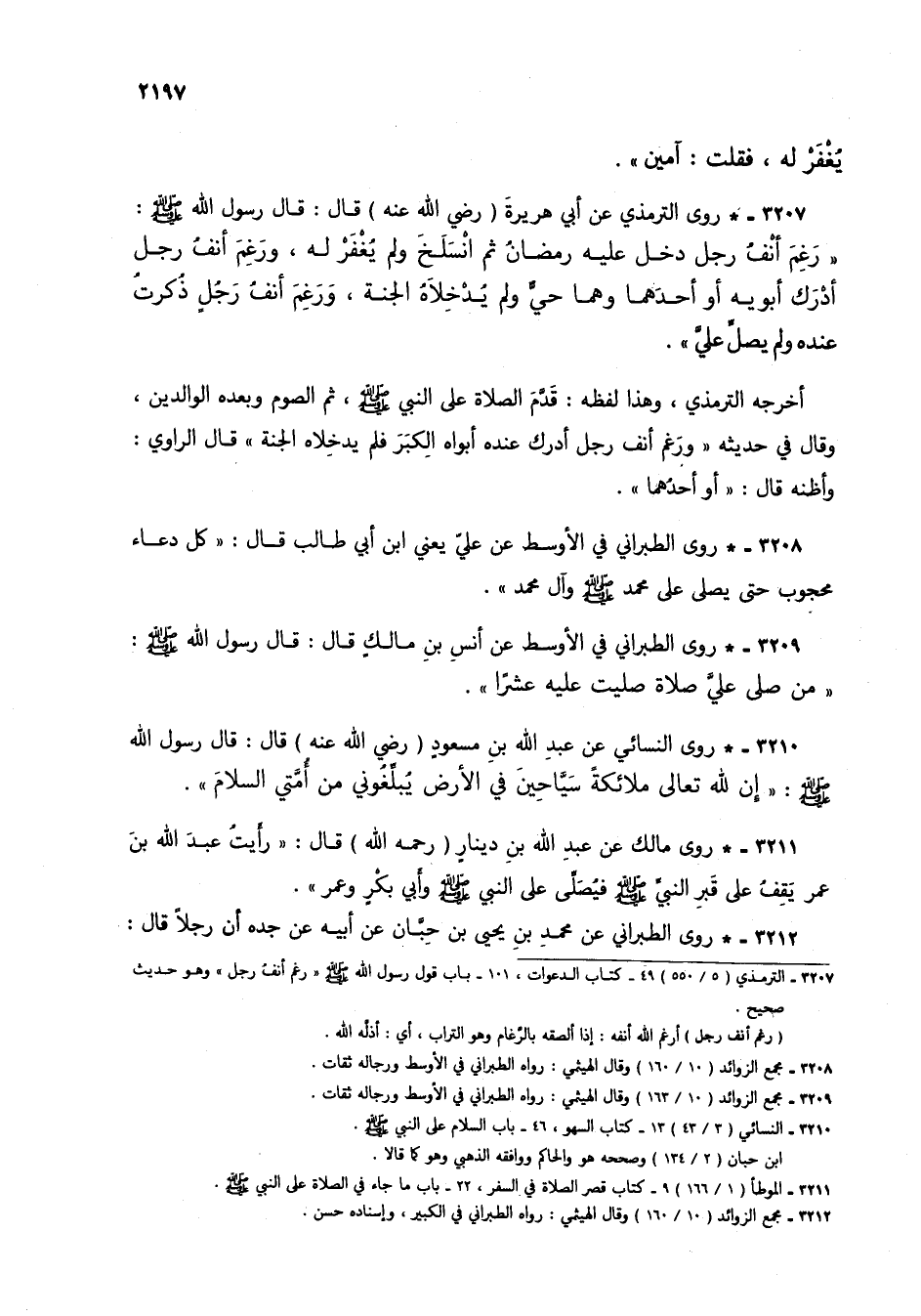 3207 - * روى الترمذي عن أبي هريرة (رضي الله عنه) قال: قال رسول الله صلى الله عليه وسلم: "رغم أنف رجل دخل عليه رمضان ثم انسلخ ولم يغفر له، ورغم أنف رجل أدرك أبويه أو أحدهما وهما حي ولم يدخلاه الجنة، ورغم أنف رجل ذكرت عنده ولم يصل علي".