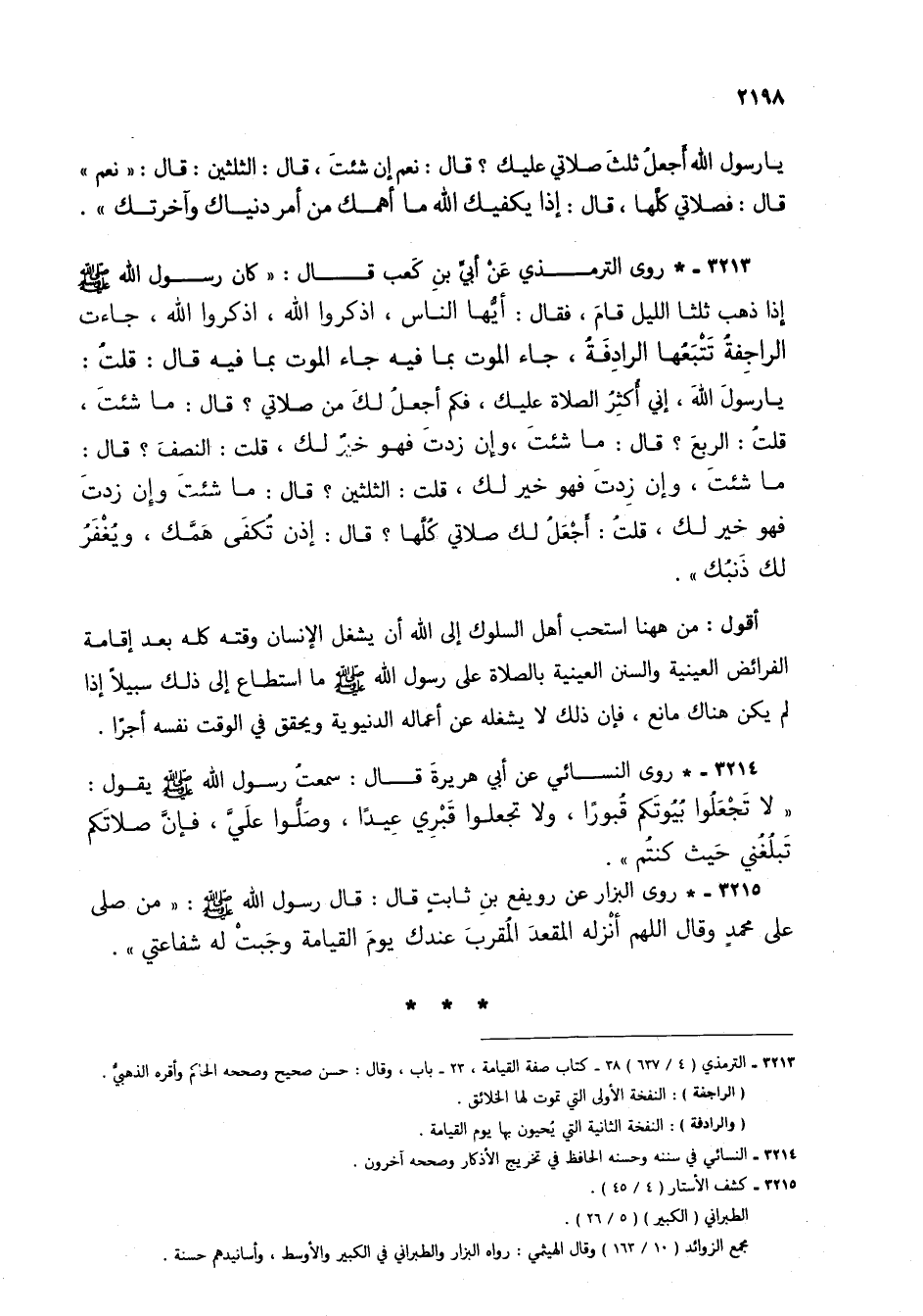 3213 - * روى الترمذي عن أبي بن كعب قال: "كان رسول الله صلى الله عليه وسلم إذا ذهب ثلثا الليل قام، فقال: أيها الناس، اذكروا الله، اذكروا الله، جاءت الراجفة تتبعها الرادفة، جاء الموت بما فيه جاء الموت بما فيه قال: قلت: يا رسول الله، إني أكثر الصلاة عليك، فكم أجعل لك من صلاتي؟ قال: ما شئت، قلت: الربع؟ قال: ما شئت، وإن زدت فهو خير لك، قلت: النصف؟ قال: ما شئت، وإن زدت فهو خير لك، قلت: الثلثين؟ قال: ما شئت وإن زدت فهو خير لك، قلت: أجعل لك صلاتي كلها؟ قال: إذن تكفي همك، ويغفر لك ذنبك".