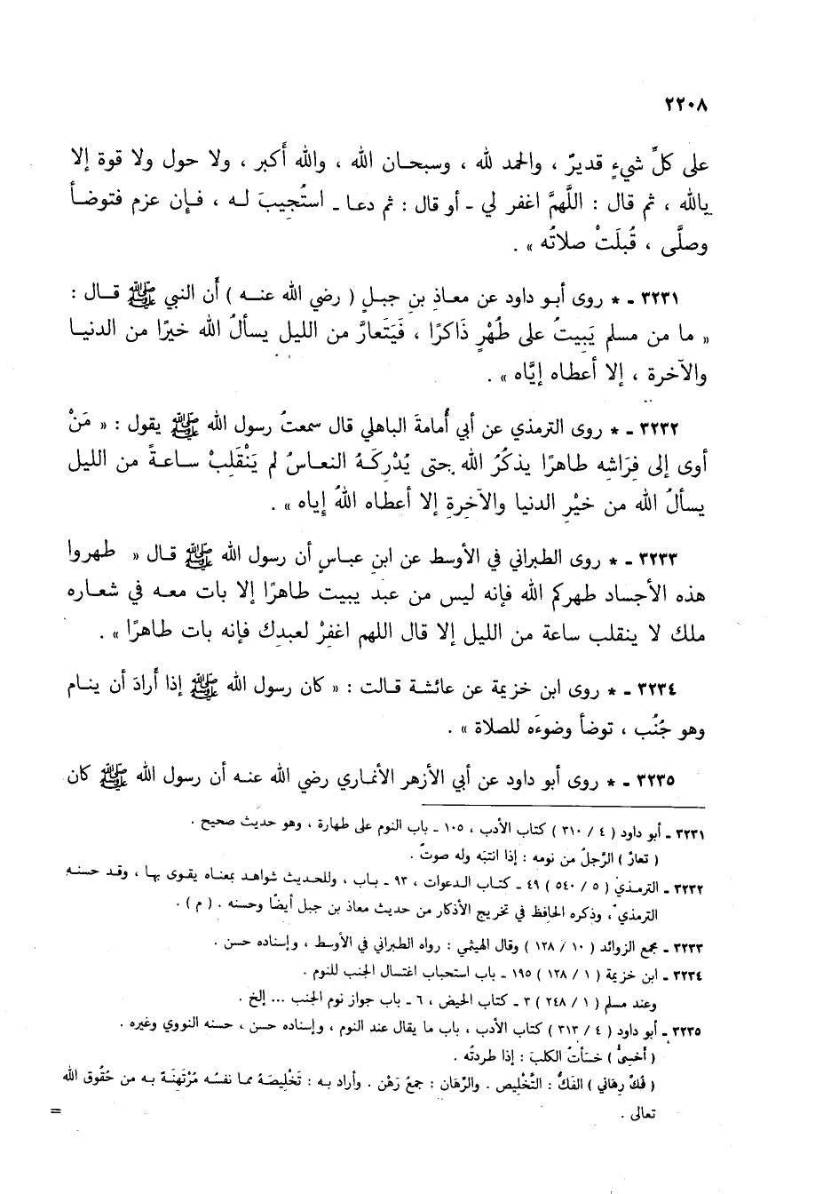 3231 - * روى أبو داود عن معاذ بن جبل (رضي الله عنه) أن النبي صلى الله عليه وسلم قال: "ما من مسلم يبيت على طهر ذاكراً، فيتعار من الليل يسأل الله خيراً من الدنيا والآخرة، إلا أعطاه إياه".