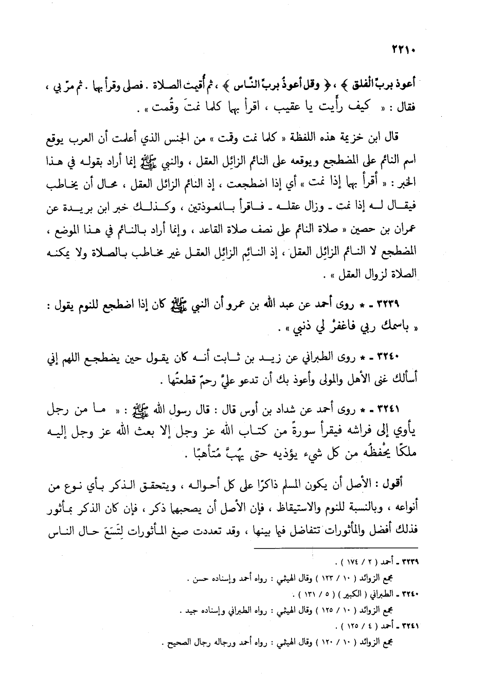 قال ابن خزيمة هذه اللفظة "كلما نمت وقمت" من الجنس الذي أعلمت أن العرب يوقع اسم النائم على المضطجع ويوقعه على النائم الزائل العقل، والنبي صلى الله عليه وسلم إنما أراد بقوله في هذا الخبر: "اقرأ بهما إذا نمت- وزال عقله- فاقرأ بالمعوذتين، وكذلك خبر ابن بريدة عن عمران بن حصين "صلاة النائم على نصف صلاة القاعد، وإنما أراد بالنائم في هذا الموضع، المضطجع لا النائم الزائل العقل، إذ النائم الزائل العقل غير مخاطب بالصلاة ولا يمكنه الصلاة لزوال العقل".