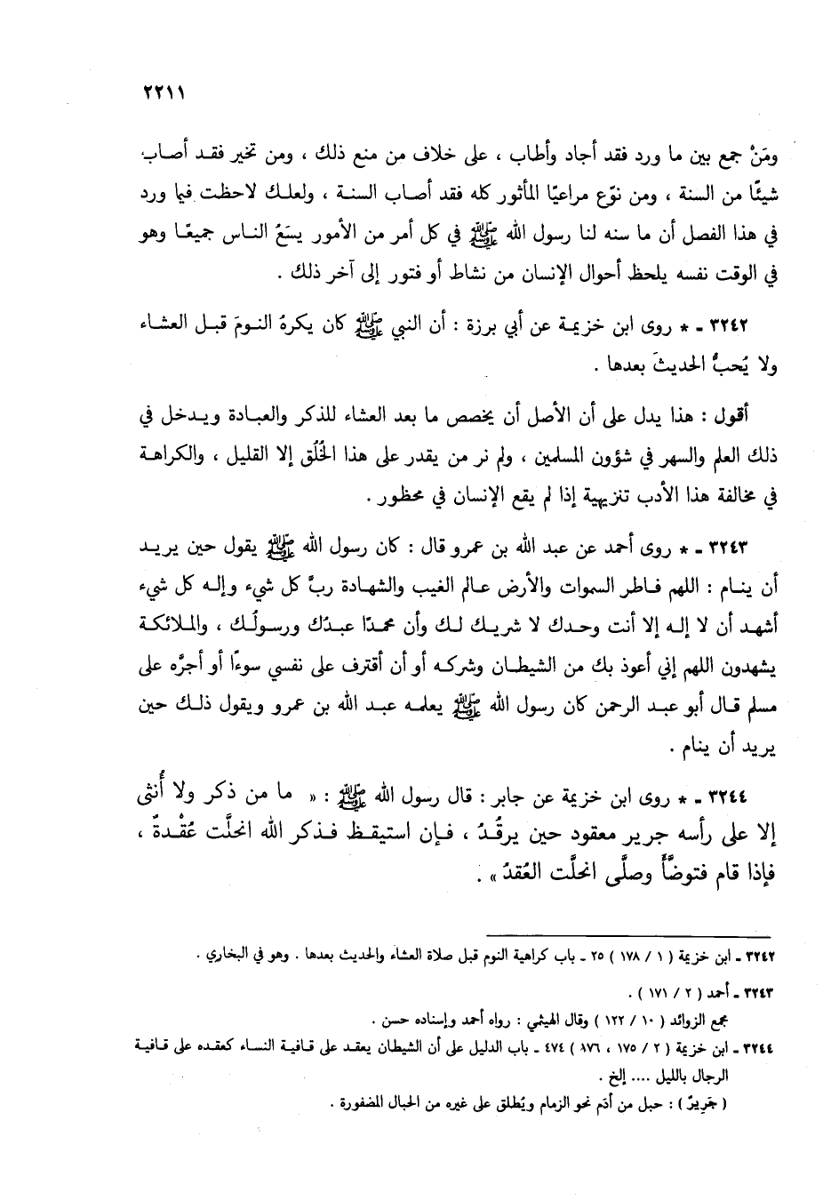 3244 - * روى ابن خزيمة عن جابر: قال رسول الله صلى الله عليه وسلم: "ما من ذكر ولا أنثى إلا على رأسه جرير معقود حين يرقد، فإن استيقظ فذكر الله انحلت عقدة، فإذا قام فتوضأ وصلى انحلت العقد".