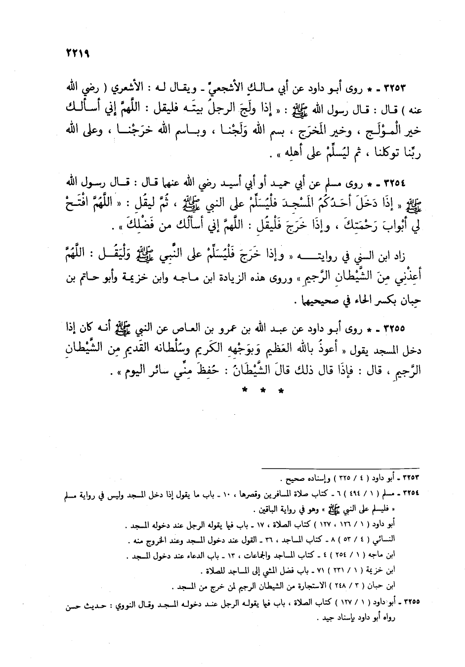 3254 - * روى مسلم عن أبي حميد أو أبي أسيد رضي الله عنهما قال: قال رسول الله صلى الله عليه وسلم "إذا دخل أحدكم المسجد فليسلم على النبي صلى الله عليه وسلم، ثم ليقل: "اللهم افتح لي أبواب رحمتك، وإذا خرج فليقل: اللهم إني أسألك من فضلك".