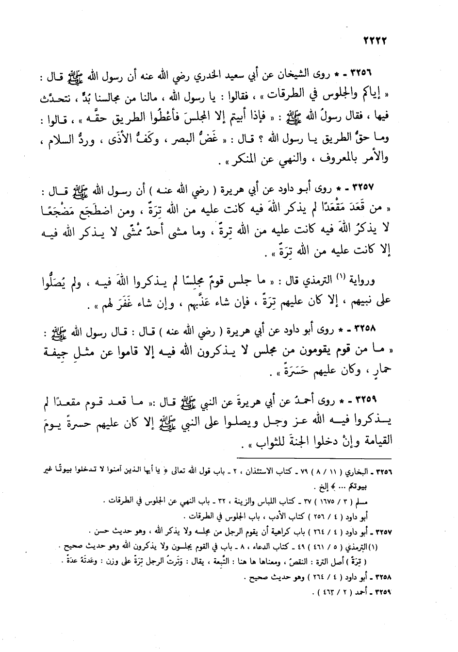 3256 - * روى الشيخان عن أبي سعيد الخدري رضي الله عنه أن رسول الله صلى الله عليه وسلم قال: "إياكم والجلوس في الطرقات"، فقالوا: يا رسول الله، ما لنا من مجالسنا بد، نتحدث فيها، فقال رسول الله صلى الله عليه وسلم: "فإذا أبيتم إلا المجلس فأعطوا الطريق حقه"، قالوا: وما حق الطريق يا رسول الله؟ قال: "غض البصر، وكف الأذى، ورد السلام، والأمر بالمعروف، والنهي عن المنكر".