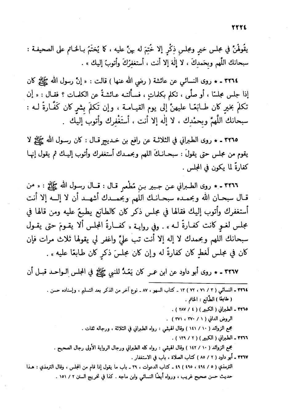 3265 - * روى الطبراني في الثلاثة عن رافع بن خديج قال: كان رسول الله صلى الله عليه وسلم لا يقوم من مجلس حتى يقول: سبحانك اللهم وبحمدك أستغفرك وأتوب إليك ثم يقول إنها كفارة لما يكون في المجلس.