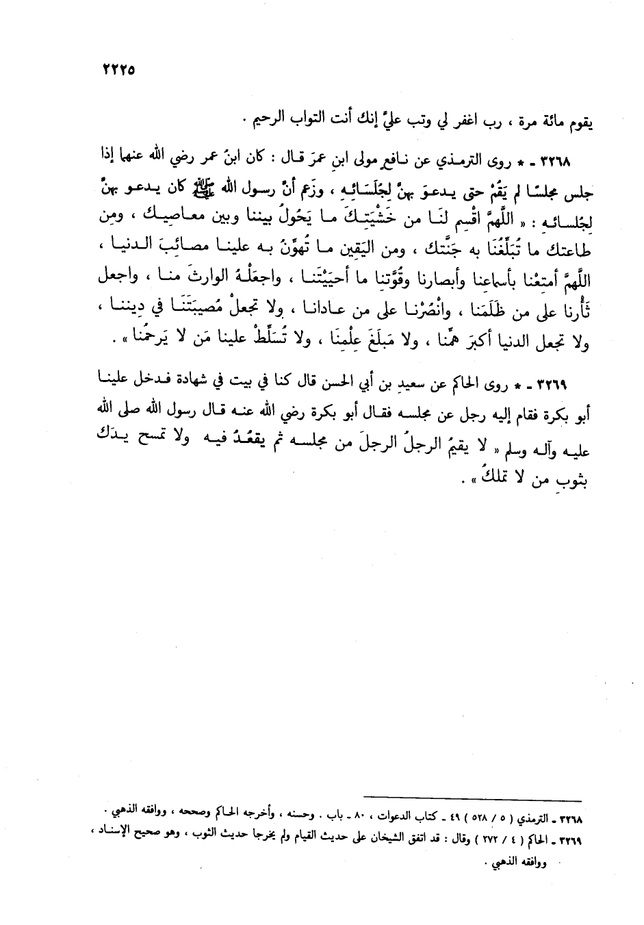 3268 - * روى الترمذي عن نافع مولى ابن عمر قال: كان ابن عمر رضي الله عنهما إذا جلس مجلساً لم يقم حتى يدعو بهن لجلسائه، وزعم أن رسول الله صلى الله عليه وسلم كان يدعو بهن لجلسائه: "اللهم اقسم لنا من خشيتك ما يحول بيننا وبين معاصيك، ومن طاعتك ما تبلغنا به جنتك، ومن اليقين ما تهون به علينا مصائب الدنيا، اللهم أمتعنا بأسماعنا وأبصارنا وقوتنا ما أحييتنا، واجعله الوارث منا، واجعل ثأرنا على من ظلمنا، وانصرنا على من عادانا، ولا تجعل مصيبتنا في ديننا، ولا تجعل الدنيا أكبر همنا، ولا مبلغ علمنا، ولا تسلط علينا من لا يرحمنا".