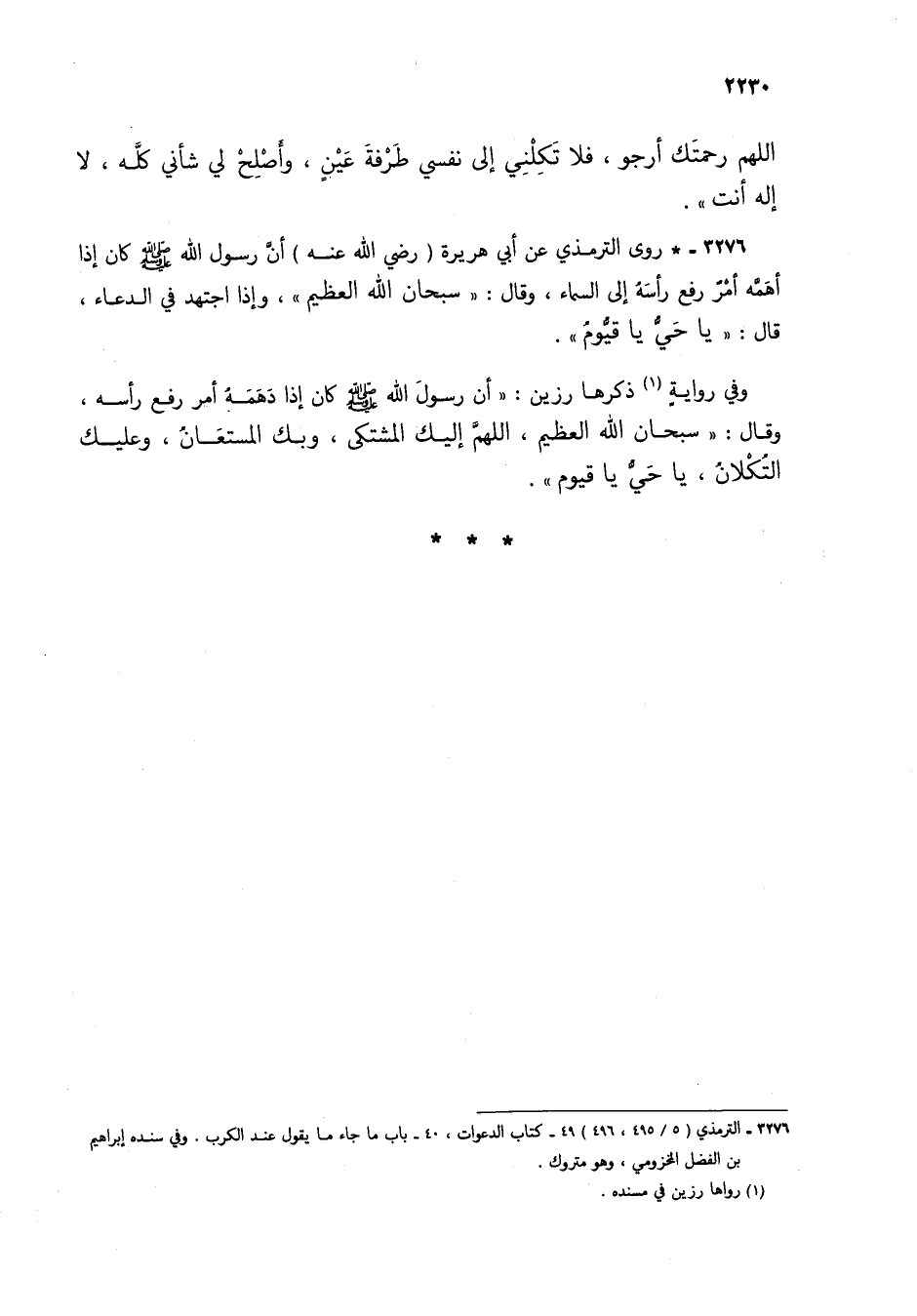 3276 - * روى الترمذي عن أبي هريرة (رضي الله عنه) أن رسول الله صلى الله عليه وسلم كان إذا أهمه أمر رفع رأسه إلى السماء، وقال: "سبحان الله العظيم"، وإذا اجتهد في الدعاء، قال: "يا حي يا قيوم".