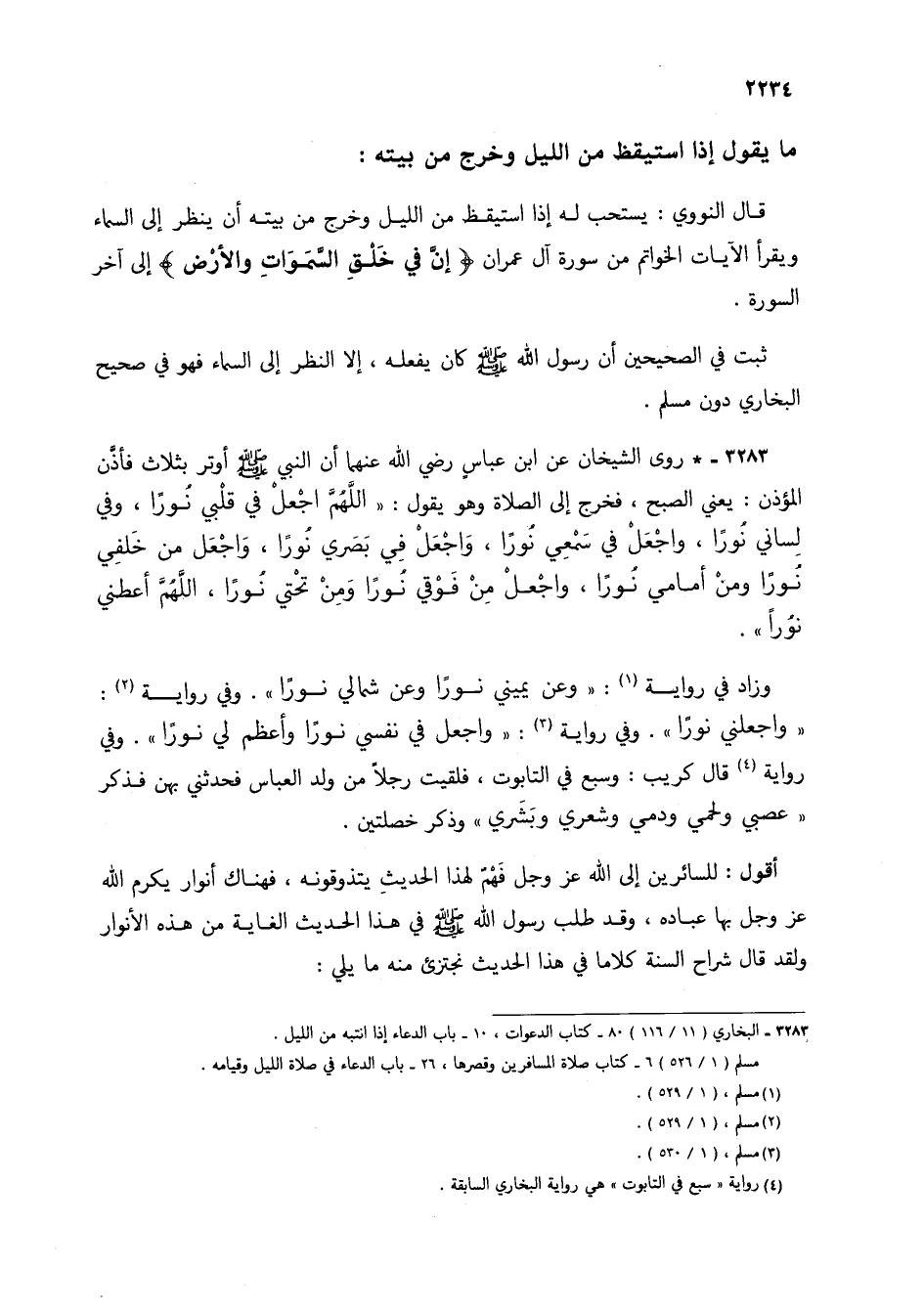 3283 - * روى الشيخان عن ابن عباس رضي الله عنهما أن النبي صلى الله عليه وسلم أوتر بثلاث فأذن المؤذن: يعني الصبح، فخرج إلى الصلاة وهو يقول: "اللهم اجعل في قلبي نوراً، وفي لساني نوراً، واجعل في سمعي نوراً، واجعل في بصري نوراً، واجعل من خلفي نوراً ومن أمامي نوراً، واجعل من فوقي نوراً ومن تحتي نوراً، اللهم أعطني نوراً".