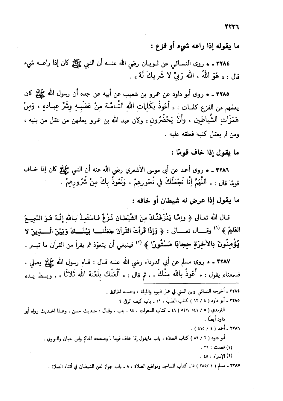 3286 - * روى أحمد عن أبي موسى الأشعري رضي الله عنه أن النبي صلى الله عليه وسلم كان إذا خاف قوماً قال: "اللهم إنا نجعلك في نحورهم، ونعوذ بك من شرورهم".