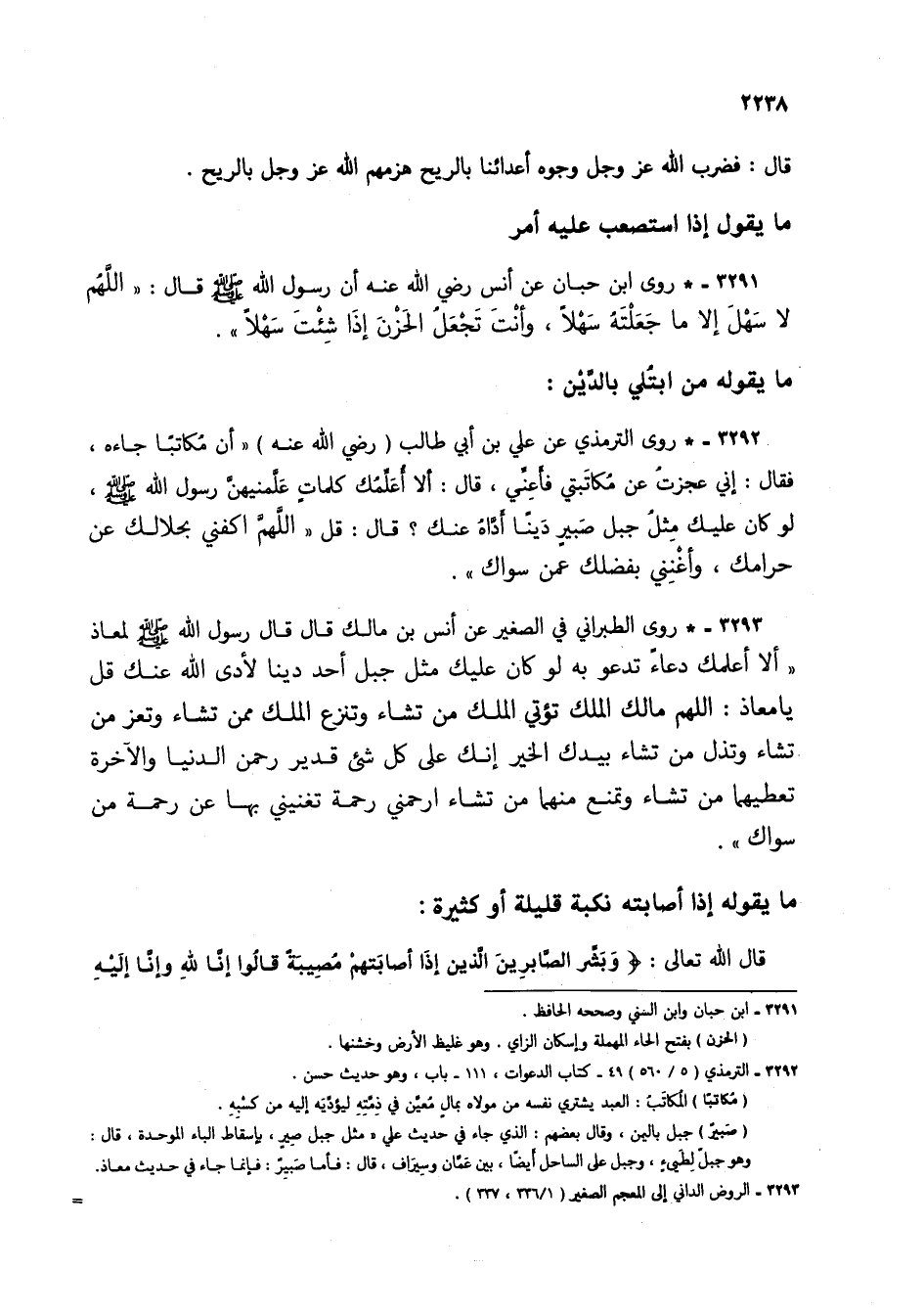 3292 - * روى الترمذي عن علي بن أبي طالب (رضي الله عنه) "أن مكاتباً جاءه، فقال: إني عجزت عن مكاتبتي فأعني، قال: ألا أعلمك كلمات علمنيهن رسول الله صلى الله عليه وسلم، لو كان عليك مثل جبل صبير ديناً أداه عنك؟ قال: قل "اللهم اكفني بحلالك عن حرامك، وأغنني بفضلك عمن سواك".