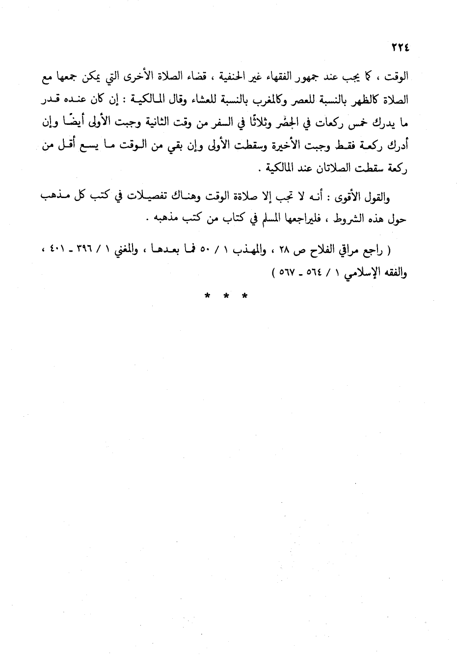 والقول الأقوى: أنه لا تجب إلا صلاة الوقت وهناك تفصيلات في كتب كل مذهب حول هذه الشروط، فليراجعها المسلم في كتاب من كتب مذهبه.