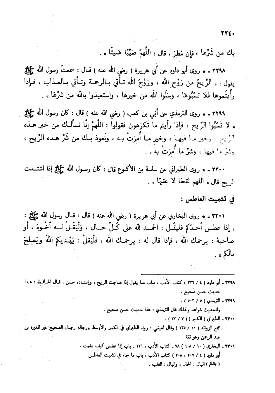 3299 - * روى الترمذي عن أبي بن كعب (رضي الله عنه) قال: كان رسول الله صلى اله عليه وسلم "لا تسبوا الريح، فإذا رأيتم ما تكرهون فقولوا: اللهم إنا نسألك من خير هذه الريح، وخير ما فيها، وخير ما أمرت به، ونعوذ بك من شر هذه الريح، وشر ما فيها، وشر ما أمرت به".