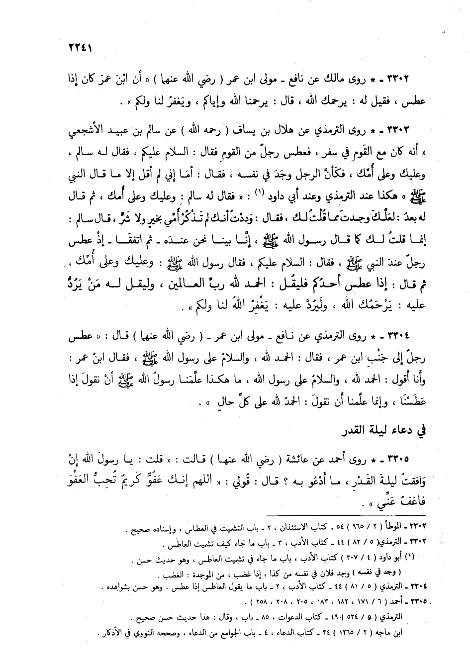 3305 - * روى أحمد عن عائشة (رضي الله عنها) قالت: "قلت: يا رسول الله إن وافقت ليلة القدر، ما أدعو به؟ قال: قولي: "اللهم إنك عفو كريم تحب العفو فاعف عني".