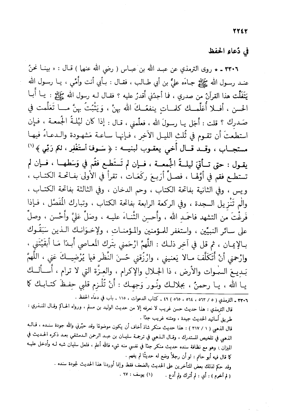 3306 - * روى الترمذي عن عبد الله بن عباس (رضي الله عنمها) قال: "بينا نحن عند رسول الله صلى الله عليه وسلم جاءه علي بن أبي طالب، فقال: بأبي أنت وأمي، يا رسول الله يتفلت هذا القرآن من صدري، فما أجدني أقدر عليه؟ فقال له رسول الله صلى الله عليه وسلم: يا أبا الحسن، أفلا أعلمك كلمات ينفعك الله بهن، ويثبت بهن ما تعلمت في صدرك؟ قلت: أجل يا رسول الله، فعلمني، قال: إذا كان ليلة الجمعة، فإن استطعت أن تقوم في ثلث الليل الآخر، فإنها ساعة مشهودة والدعاء فيها مستجاب، وقد قال أخي يعقوب لبنيه: {سَوْفَ أَسْتَغْفِرُ، لَكُمْ رَبِّي} (1) يقول: حتى تأتي ليلة الجمعة، فإن لم تستطع فقم في وسطها، فإن لم تستطع فقم في أولها، فصل أربع ركعات، تقرأ في الأولى بفاتحة الكتاب، ويس، وفي الثانية بفاتحة الكتاب، وحم الدخان، وفي الثالثة بفاتحة الكتاب، والم تنزيل السجدة، وفي الركعة الرابعة بفاتحة التكاب، وتبارك المفصل، فإذا فرغت من التشهد فاحمد الله، وأحسن الثناء عليه، وصل علي وأحسن، وصل على سائر النبيين، واستغفر للمؤمنين والمؤمنات، ولإخوانك الذين سبقوك بالإيمان، ثم قل في آخر ذلك: اللهم ارحمني بترك المعاصي أبداً ما أبقيتني، وارحمني أن أتكلف مالا يعنيني، وارزقني حسن النظر فيما يرضيك عني، اللهم بديع السموات والأرض، ذا الجلال والإكرام، والعزة التي لا ترام، أسألك يا الله، يا رحمن، بجلالك ونور وجهك: أن تلزم قلبي حفظ كتابك كما