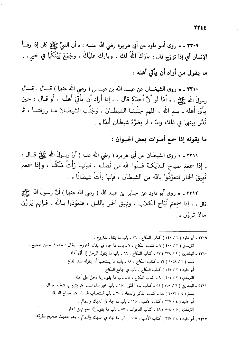 3311 - * روى الشيخان عن أبي هريرة (رضي الله عنه) أن رسول الله صلى الله عليه وسلم قال: "إذا سمعتم صياح الديكة فسلوا الله من فضله، فإنها رأت ملكاً، وإذا سمعتم نهيق الحمار فتعوذوا بالله من الشيطان، فإنها رأت شيطاناً".