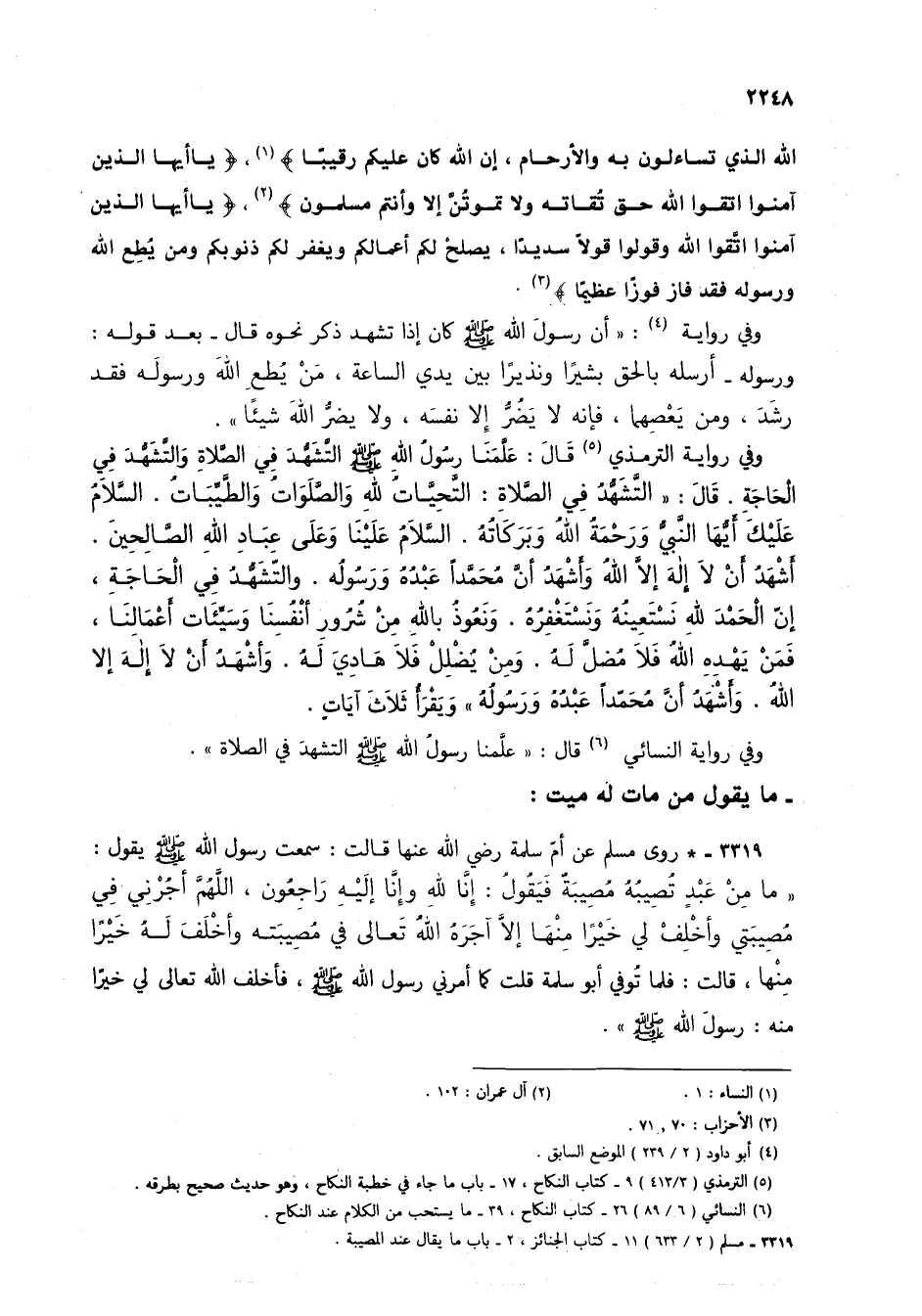 3319 - مسلم (2/ 633) 11 - كتاب الجنائز، 2 - باب ما يقال عند المصيبة.