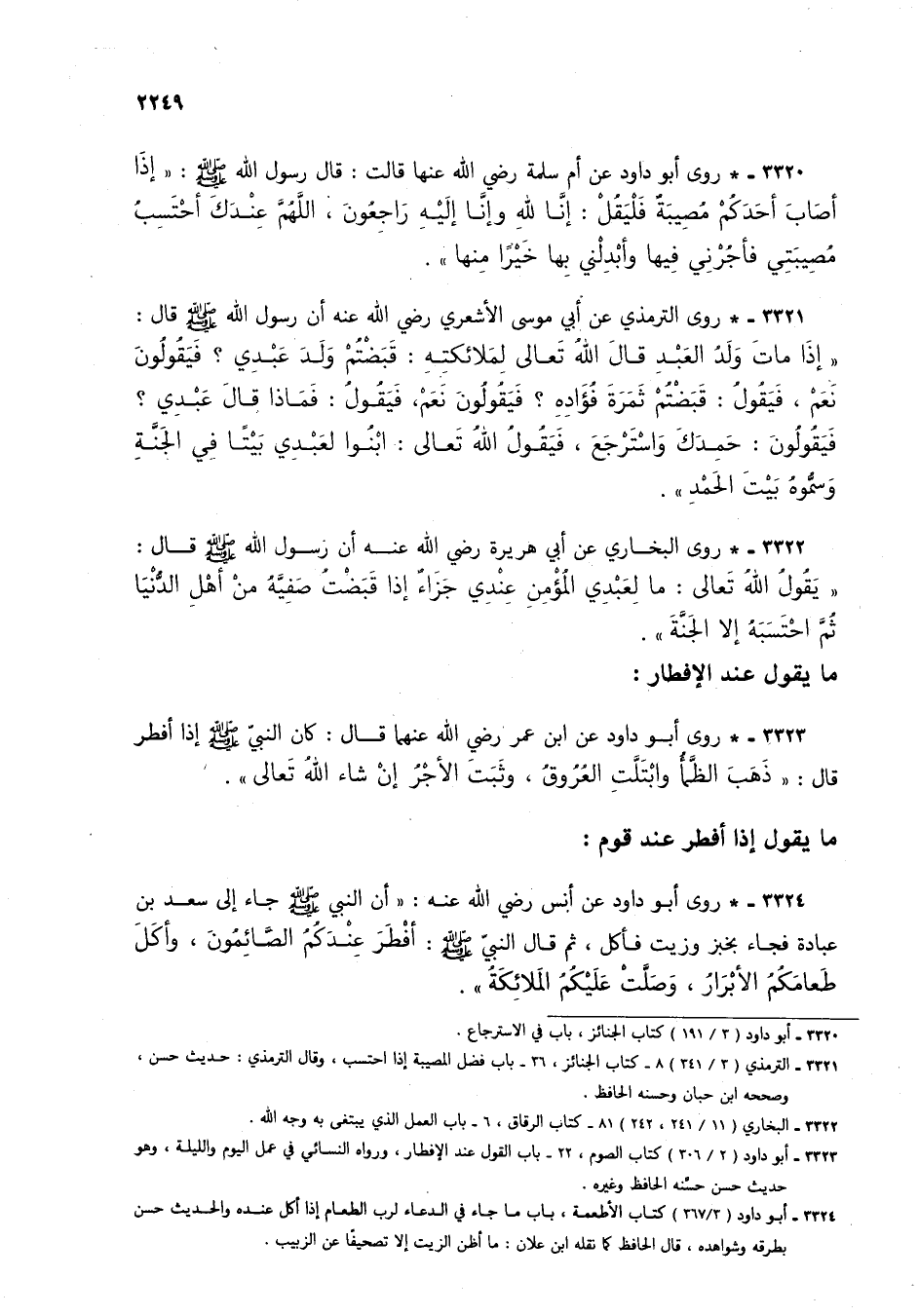 3324 - * روى أبو داود عن أنس رضي الله عنه: "أن النبي صلى الله عليه وسلم جاء إلى سعد بن عبادة فجاء بخبز وزيت فأكل، ثم قال النبي صلى الله عليه وسلم: أفطر عندكم الصائمون، وأكل طعامكم الأبرار، وصلت عليكم الملائكة".