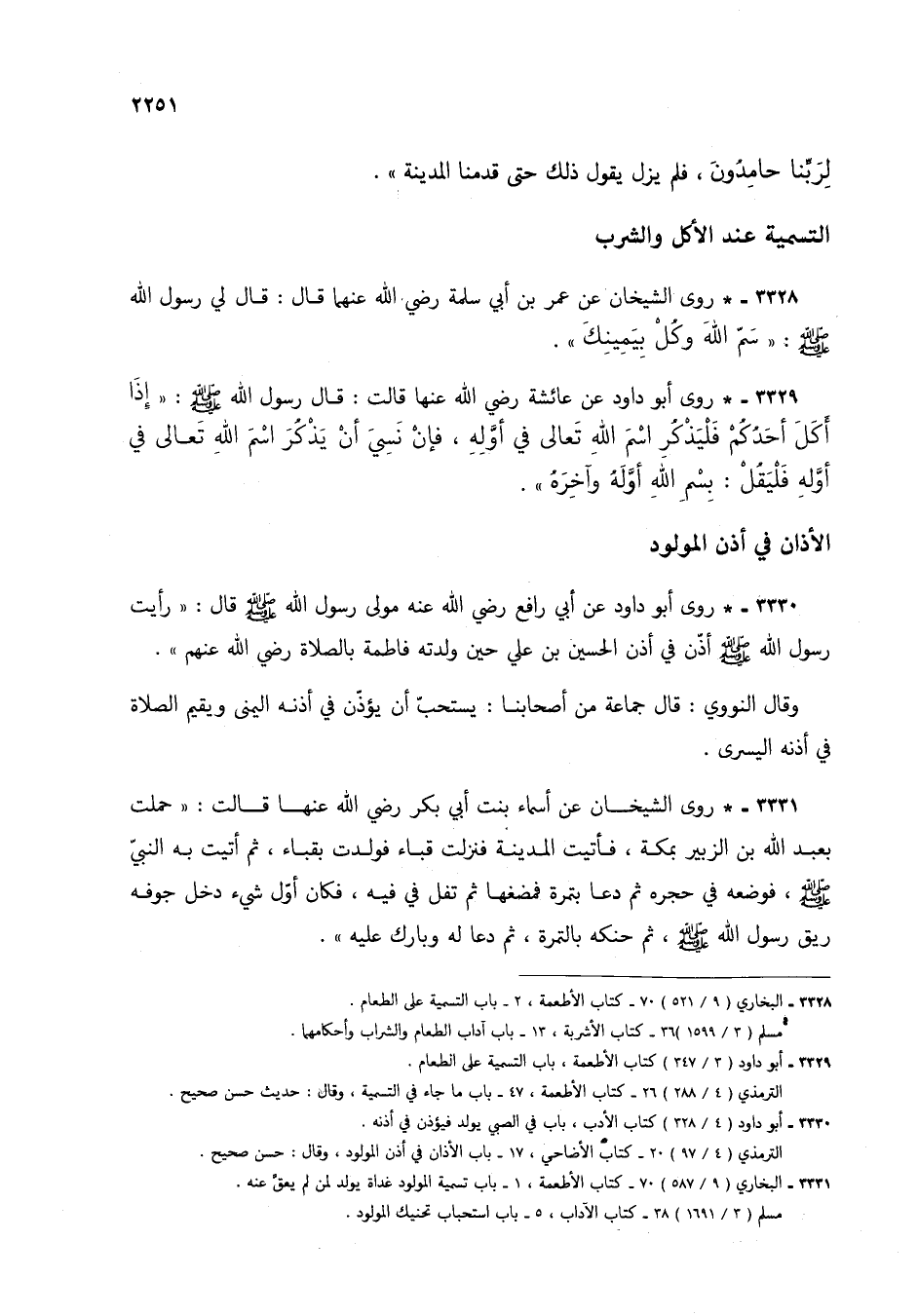 3328 - * روى الشيخان عن عمر بن أبي سلمة رضي الله عنهما قال: قال لي رسول الله صلى الله عليه وسلم: "سم الله وكل بيمينك".