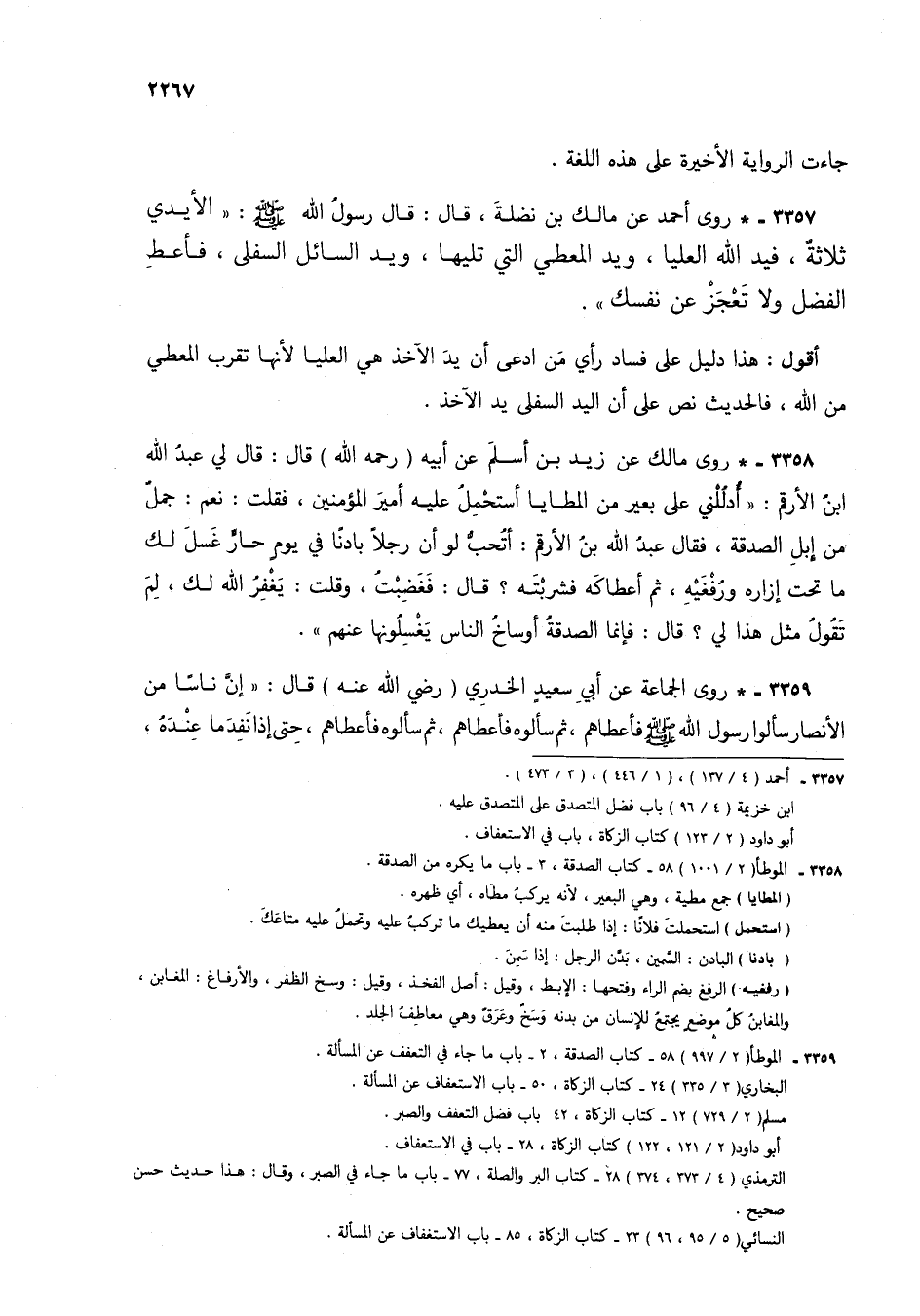 3357 - * روى أحمد عن مالك بن نضلة، قال: قال رسول الله صلى الله عليه وسلم: "الأيدي ثلاثة، فيد الله العليا، ويد المعطي التي تليها، ويد السائل السفلى، فأعط الفضل ولا تعجز عن نفسك".