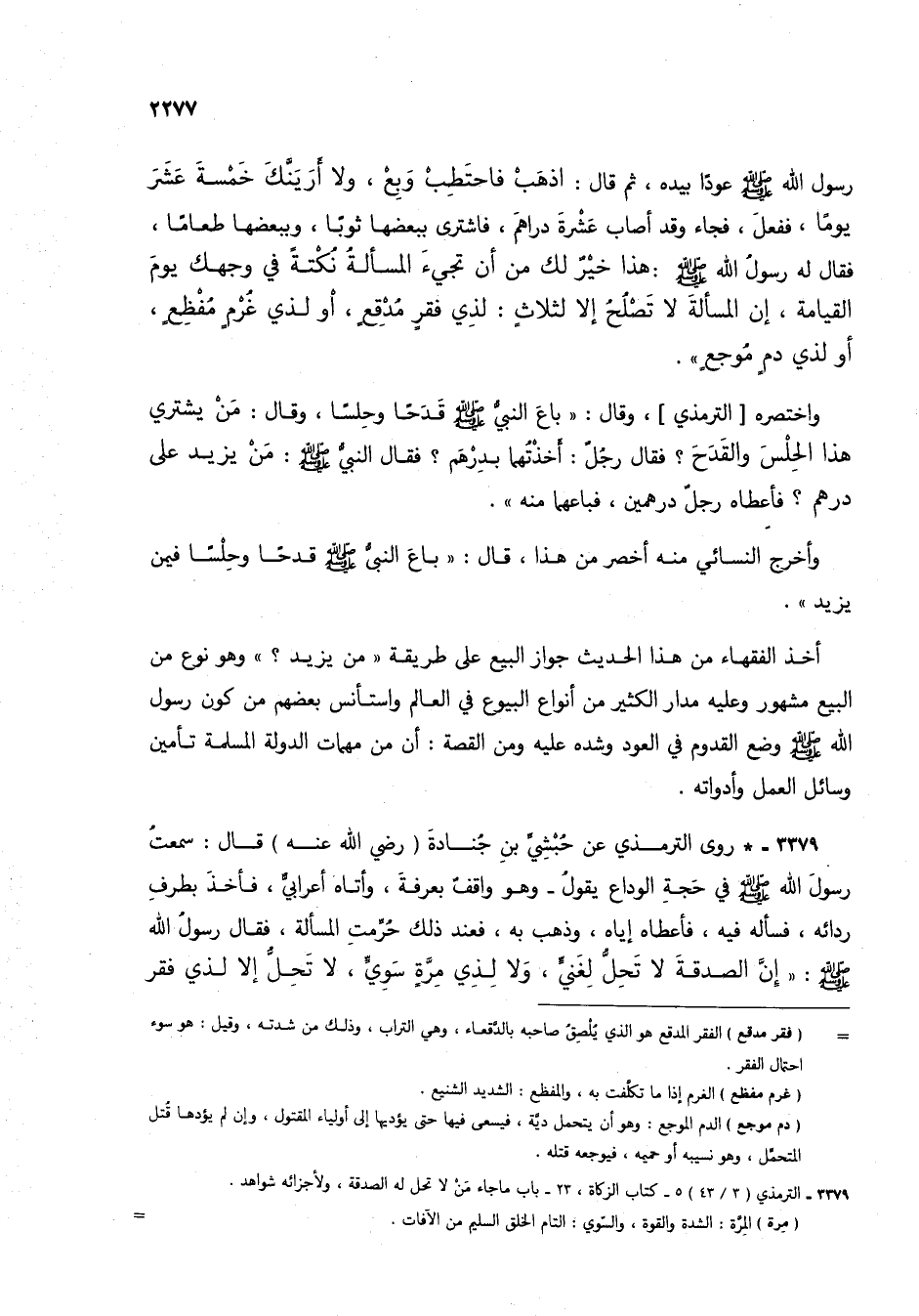 3379 - * روى الترمذي عن حبشي بن جنادة (رضي الله عنه) قال: سمعت رسول الله صلى الله عليه وسلم في حجة الوداع يقول- وهو واقف بعرفة، وأتاه أعرابي، فأخذ بطرف ردائه، فسأله فيه، فأعطاه إياه، وذهب به، فعند ذلك حرمت المسألة، فقال رسول الله صلى الله عليه وسلم: "إن الصدقة لا تحل لغني، ولا لذي مرة سوي، لا تحل إلا لذي فقر
