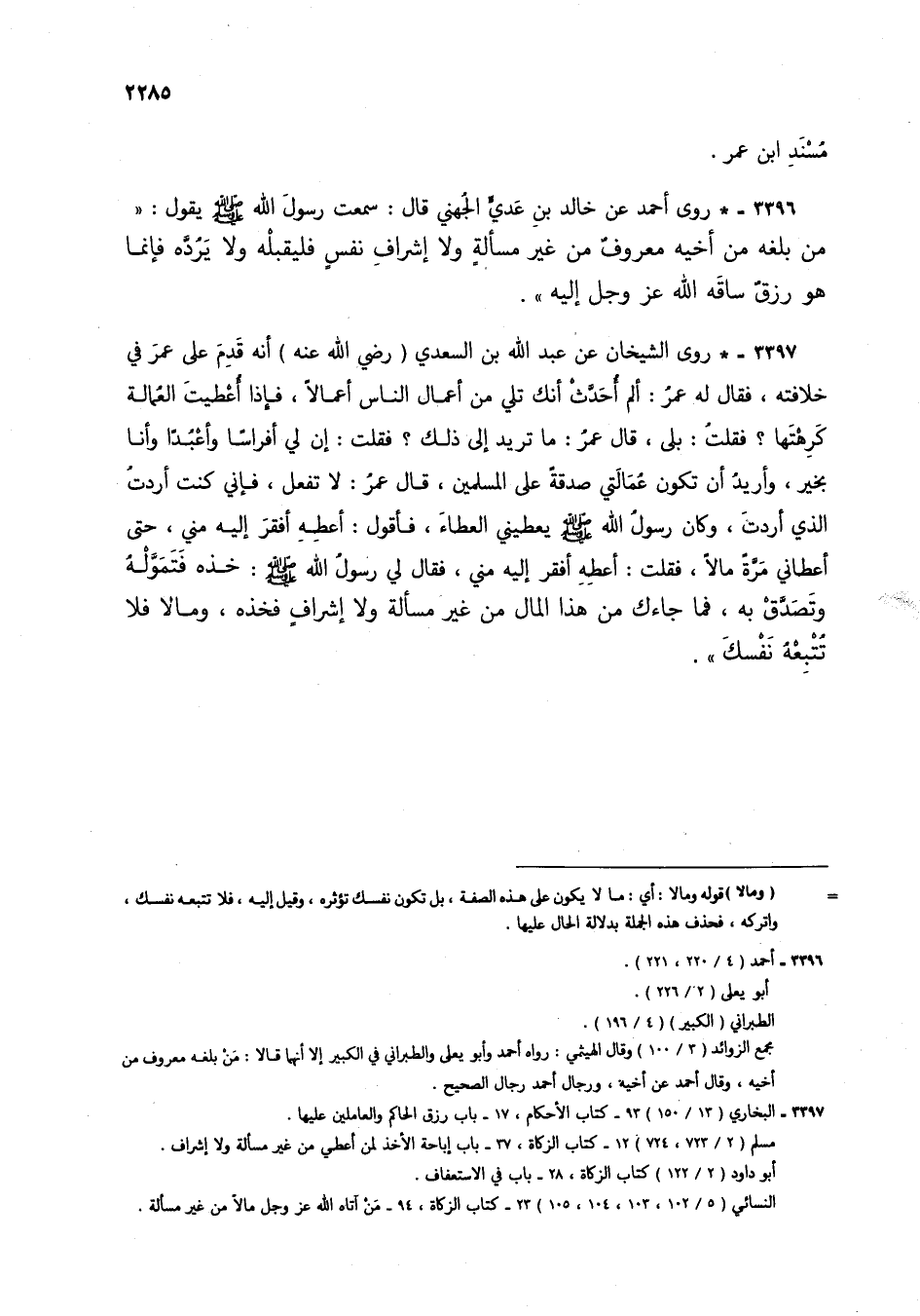 3396 - * روى أحمد عن خالد بن عدي الجهني قال: سمعت رسول الله صلى الله عليه وسلم يقول: "من بلغه من أخيه معروف من غير مسألة ولا إشراف نفس فليقبله ولا يرده فإنما هو رزق ساقه الله عز وجل إليه".