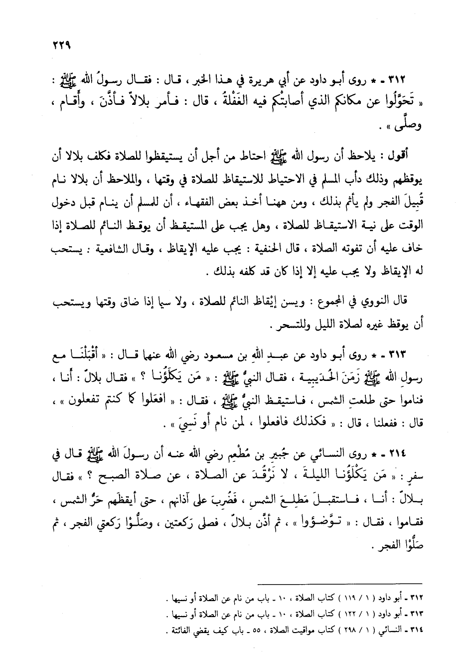 313 - * روى أبو داود عن عبد الله بن مسعود رضي الله عنهما قال: "أقْبَلْنَا مع رسول الله صلى الله عليه وسلم زمن الحديبية، فقال النبي صلى الله عليه وسلم: "من يكلؤُنا؟ " فقال بلالٌ: أنا، فناموا حتى طلعتِ الشمس، فاستيقظ النبيُّ صلى الله عليه وسلم، فقال: "افعلوا كما كنتم تفعلون"، قال: ففعلنا، قال: "فكذلك فافعلوا، لمن نام أو نسيَ".
