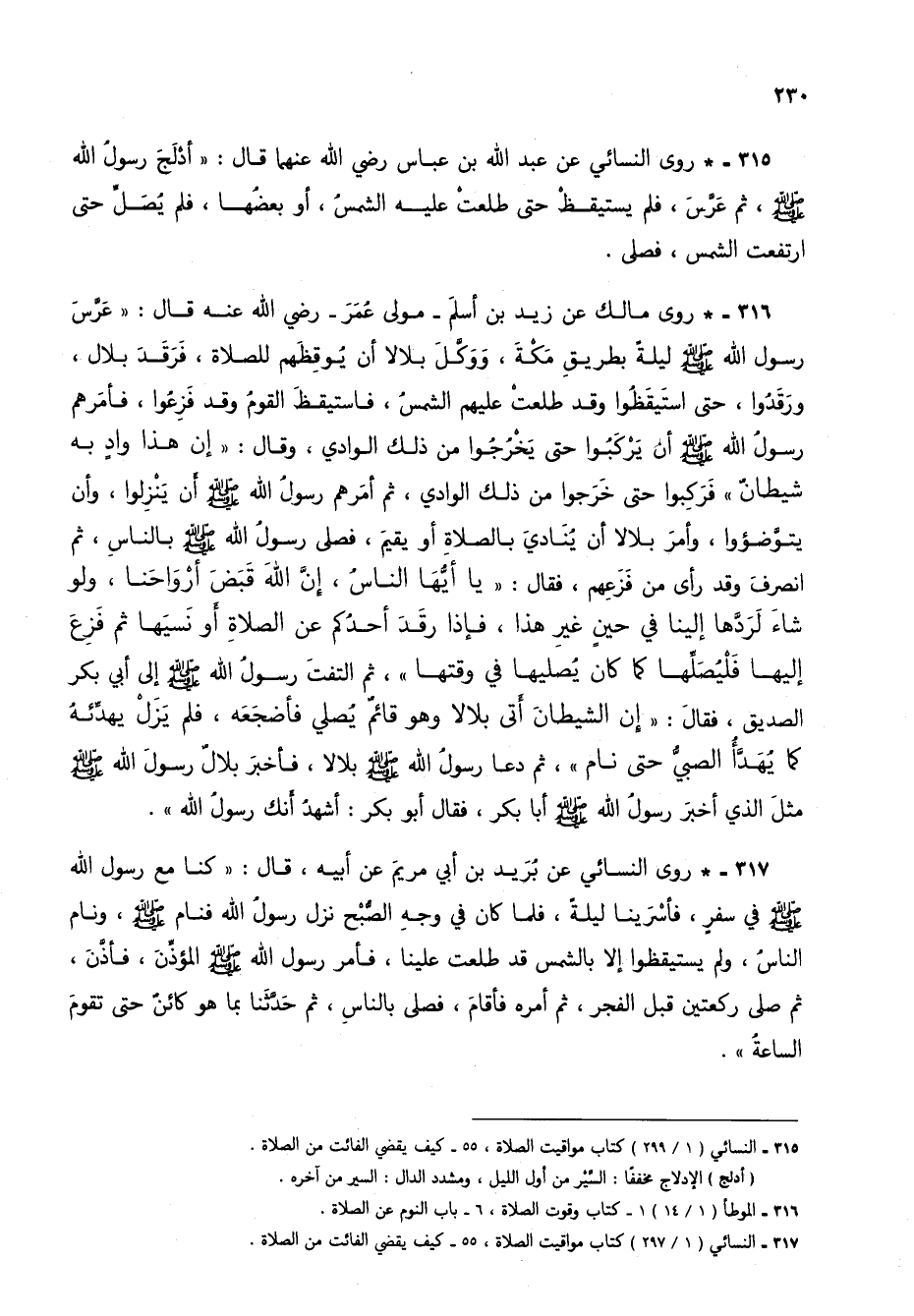 315 - * روى النسائي عن عبد الله بن عباس رضي الله عنهما قال: "أدْلَجَ رسول الله صلى الله عليه وسلم، ثم عَرَّسَ، فلم يستيقظْ حتى طلعتْ عليه الشمس، أو بعضها، فلم يصل حتى ارتفعت الشمس، فصلى.
