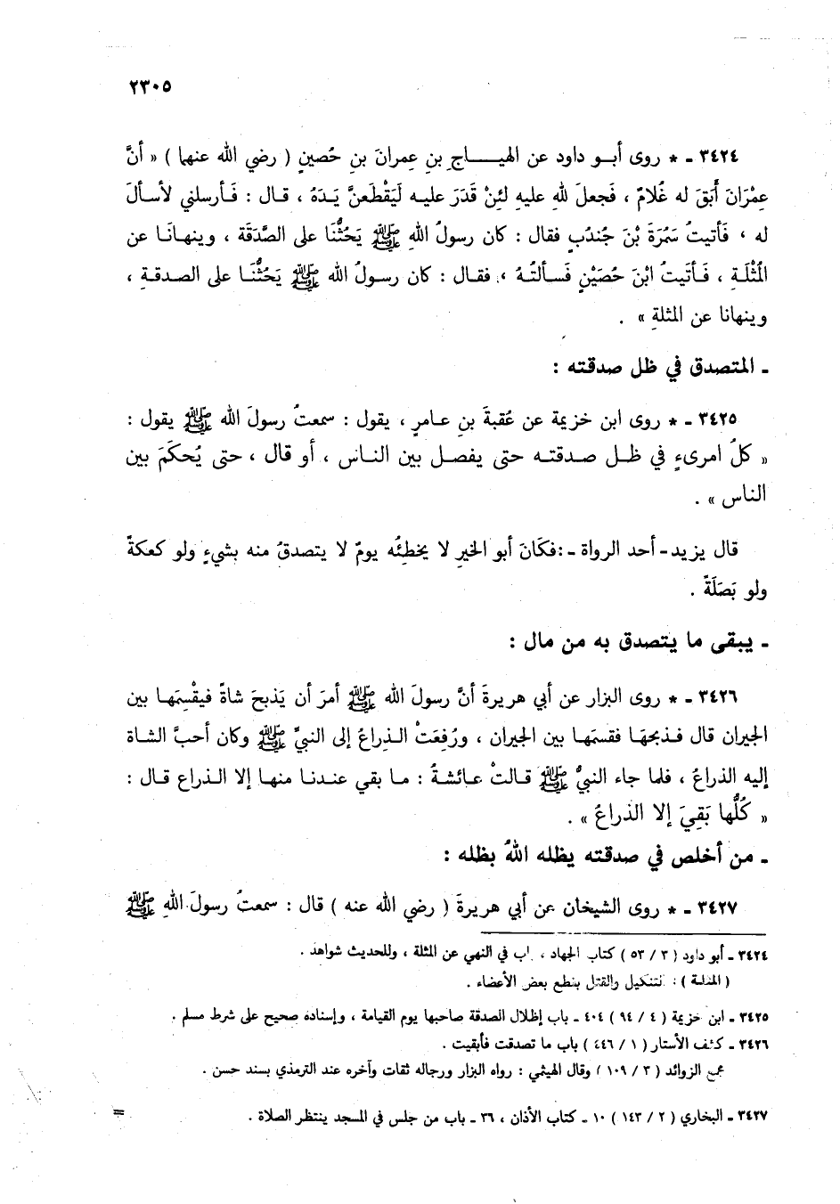 3425 - * روى ابن خزيمة عن عقبة بن عامر، يقول: سمعت رسول الله صلى الله عليه وسلم يقول: "كل امرئ في ظل صدقته حتى يفصل بين الناس، أو قال، حتى يحكم بين الناس".