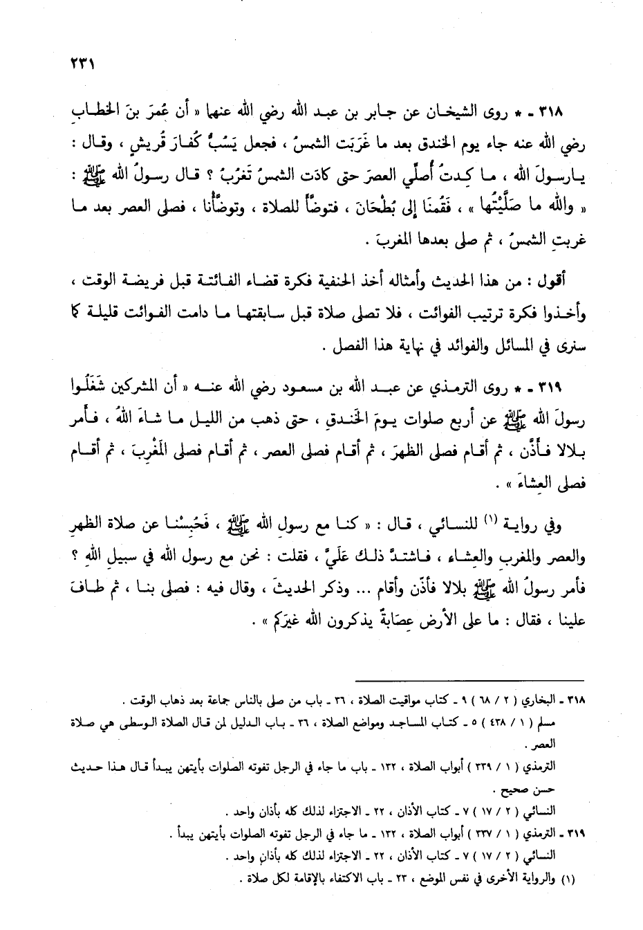 318 - * روى الشيخان عن جابر بن عبد الله رضي الله عنهما "أن عمر بن الخطاب رضي الله عنه جاء يوم الخندق بعد ما غربت الشمسُ، فجعل يسُبُّ كفار قريش، وقال: يا رسول الله، ما كدتُ أصلي العصر حتى كادت الشمسُ تغربُ؟ قال رسول الله صلى الله عليه وسلم: "والله ما صليتُها"، فقُمنا إلى بُطْحَانَ، فتوضأ للصلاة، وتوضأنا، فصلى العصر بعد ما غربت الشمس، ثم صلى بعدها المغرب.