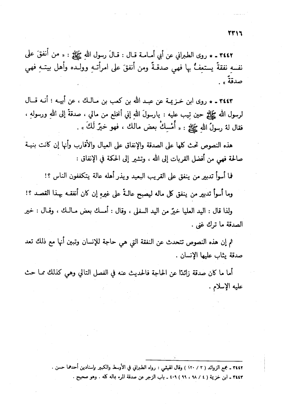3442 - * روى الطبراني عن أبي أمامة قال: قال رسول الله صلى الله عليه وسلم: "من أنفق على نفسه نفقة يستعف بها فهي صدقة ومن أنفق على امرأته وولده وأهل بيته فهي صدقة".