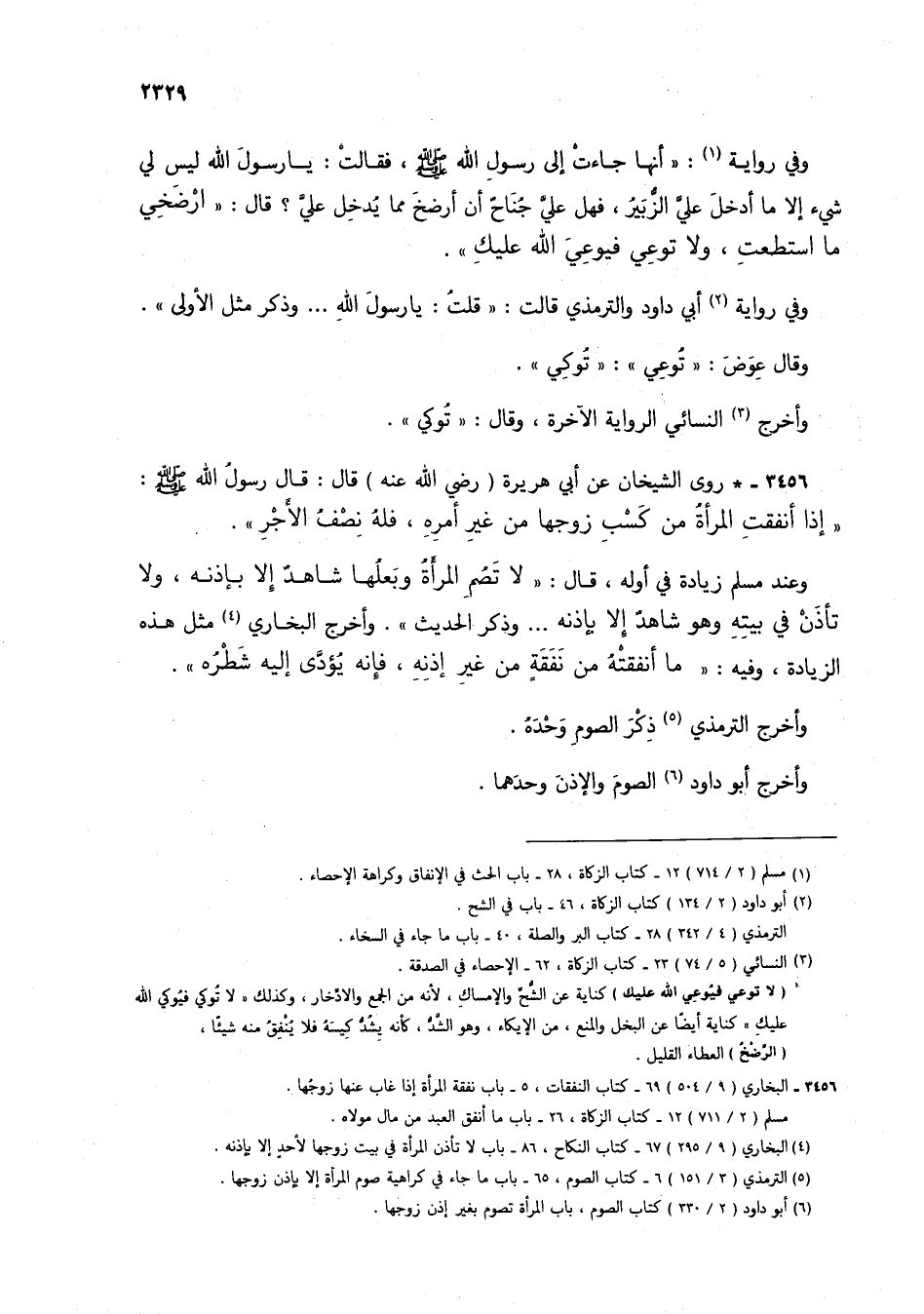 3456 - * روى الشيخان عن أبي هريرة (رضي الله عنه) قال: قال رسول الله صلى الله عليه وسلم: "إذا أنفقت المرأة من كسب زوجها من غير أمره، فله نصف الأجر".