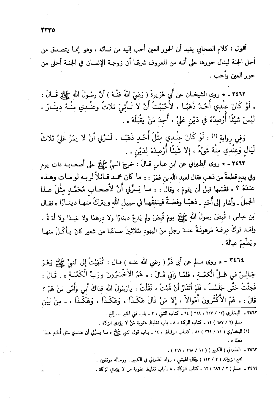 3464 - * روى مسلم عن أبي ذر (رضي الله عنه) قال: انتهيت إلى النبي صلى الله عليه وسلم وهو جالس في ظل الكعبة، فلما رآني قال: "هم الأخسرون ورب الكعبة"، قال: فجئت حتى جلست، فلم أتقار أن قمت، فقلت: يا رسول الله فداك أبي وأمي من هم؟ قال: "هم الأكثرون أموالاً، إلا من قال هكذا، وهكذا، وهكذا، - من بين
