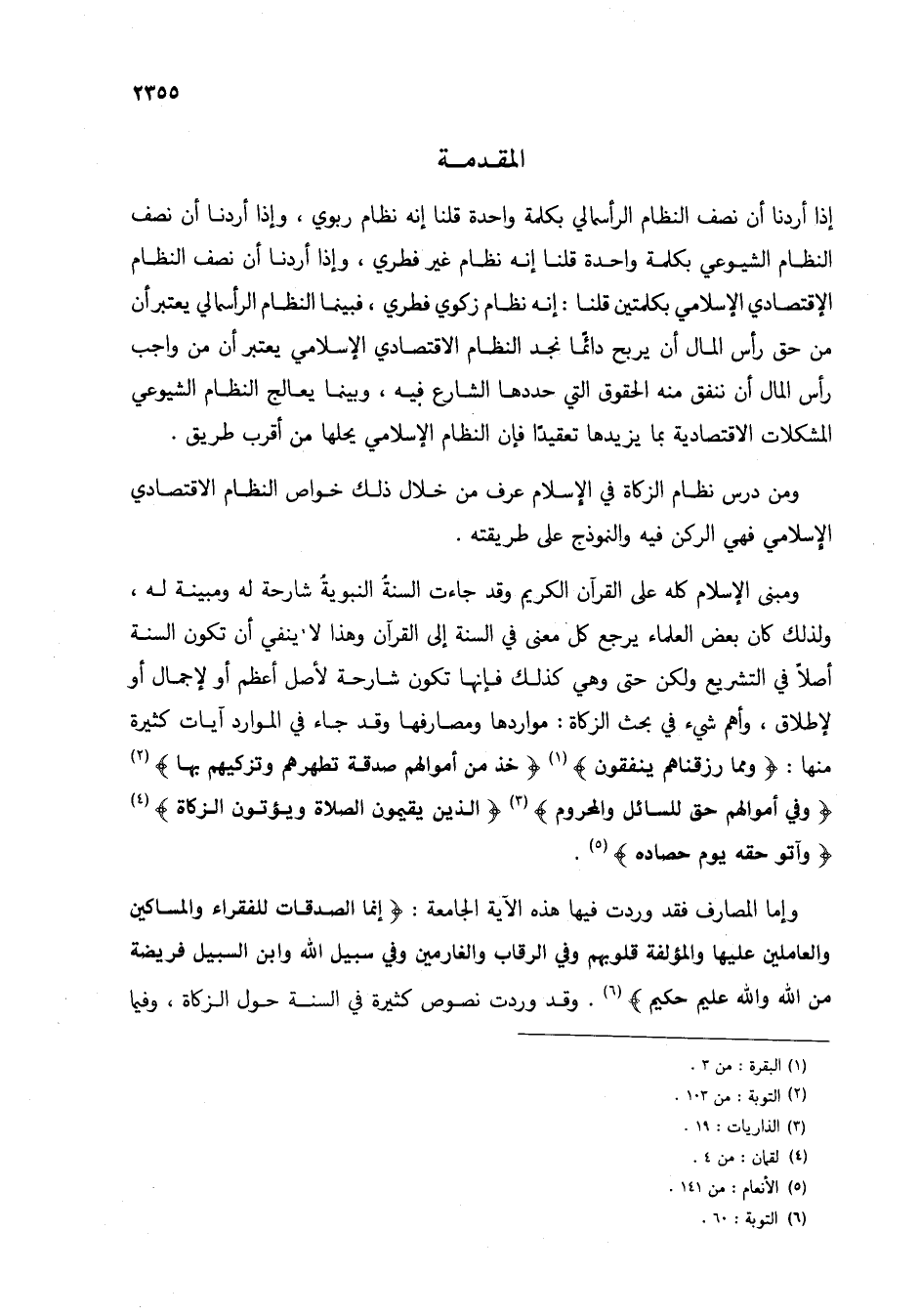 إذا أردنا أن نصف النظام الرأسمالي بكلمة واحدة قلنا إنه نظام ربوي، وإذا أردنا أن نصف النظام الشيوعي بكلمة واحدة قلنا إنه نظام غير فطري، وإذا أردنا أن نصف النظام الاقتصادي الإسلامي بكلمتين قلنا: إنه نظام زكوي فطري، فبينما النظام الرأسمالي يعتبر أن من حق رأس المال أن يربح دائماً نجد النظام الاقتصادي الإسلامي يعتبر أن من واجب رأس المال أن ننفق منه الحقوق التي حددها الشارع فيه، وبينما يعالج النظام الشيوعي المشكلات الاقتصادية بما يزيدها تعقيداً فإن النظام الإسلامي يحلها من أقرب طريق.