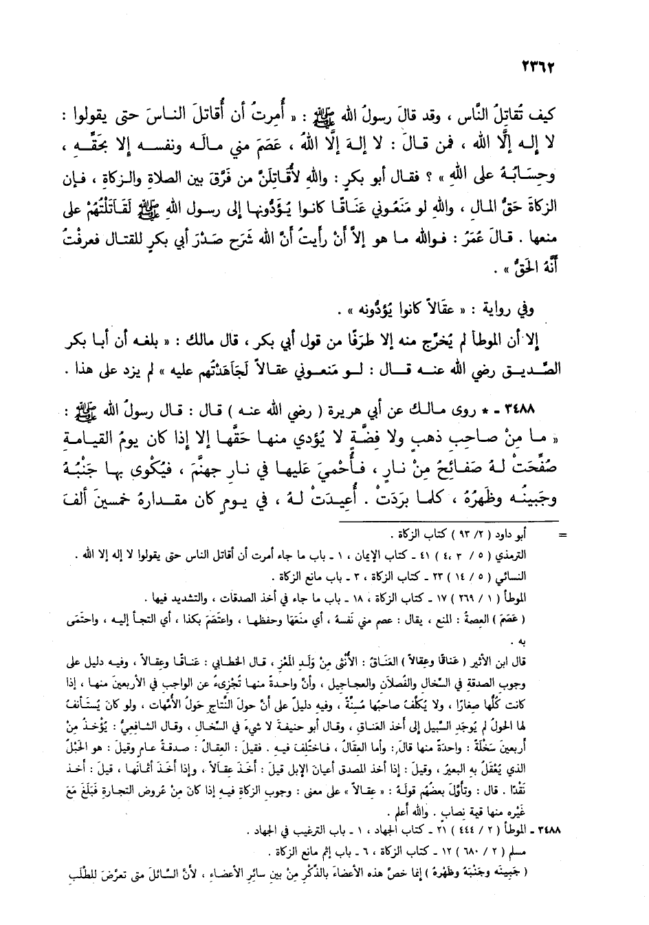 3488 - * روى مالك عن أبي هريرة (رضي الله عنه) قال: قال رسول الله صلى الله عليه وسلم: "ما من صاحب ذهب ولا فضة لا يؤدي منها حقها إلا إذا كان يوم القيامة صفحت له صفائح من نار، فأحمي عليها في نار جهنم، فيكوى بها جنبه وجبينه وظهره، كلما بردت. أعيدت له، في يوم كان مقداره خمسين ألف