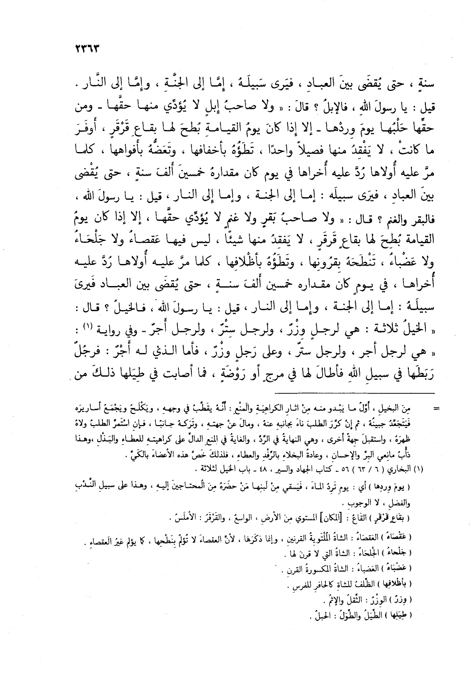 سنة، حتى يقضى بين العباد، فيرى سبيله، إما إلى الجنة، وإما إلى النار، قيل: يا رسول الله، فالإبل؟ قال: "ولا صاحب إبل يؤدي منها حقها- ومن حقها حلبها يوم وردها- إلا إذا كان يوم القيامة بطح لها بقاع قرقر، أوفر ما كانت، لا يفقد منها فصيلاً واحداً، تطؤه بأخفافها، وتعضه بأفواهها، كلما مر عليه أولاها رد عليه أخراها في يوم كان مقداره خمسين ألف سنة، حتى يقضى بين العباد، فيرى سبيله: إما إلى الجنة، وإما إلى النار، قيل: يا رسول الله، فالبقر والغنم؟ قال: "ولا صاحب بقر ولا غنم لا يؤدي حقها، إلا إذا كان يوم القيامة بطح لها بقاع قرقر، لا يفقد منها شيئاً، ليس فيها عقصاء ولا جلحاء ولا غضباء، تنطحه بقرونها، وتطؤه بأظلافها، كلما مر عليه أولاها رد عليه أخراها، في يوم كان مقداره خمسين ألف سنة، حتى يقضى بين العباد فيرى سبيله: إما إلى الجنة، وإما إلى النار، قيل: يا رسول الله، فالخيل؟ قال: "الخيل ثلاثة: هي لرجل وزر، ولرجل ستر، ولرجل أجر- وفي رواية (1): "هي لرجل أجر، ولرجل ستر، وعلى رجل وزر، فأما الذي له أجر: فرجل ربطها في سبيل الله فأطال لها في مرج أو روضة، فما أصابت في طيلها ذلك من