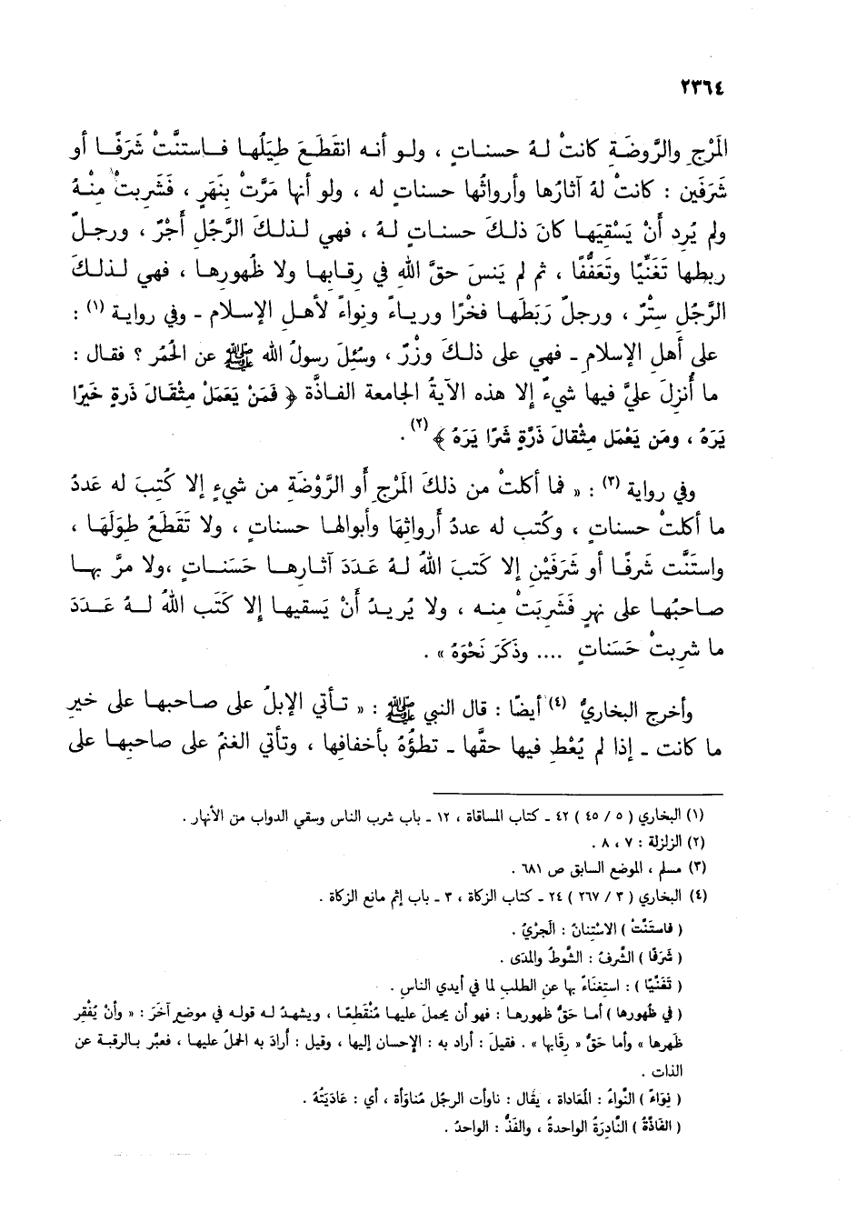 وفي رواية (3): "فما أكلت من ذلك المرج أو الروضة من شيء إلا كتب له عدد ما أكلت حسنات، وكتب له عدد أرواثها وأبوالها حسنات، ولا تقطع طولها، واستنت شرفاً أو شرفين إلا كتب الله له عدد آثارها حسنات، ولا مر بها صاحبها على نهر فشربت منه، ولا يريد أن يسقيها إلا كتب الله له عدد ما شربت حسنات .. وذكر نحوه".